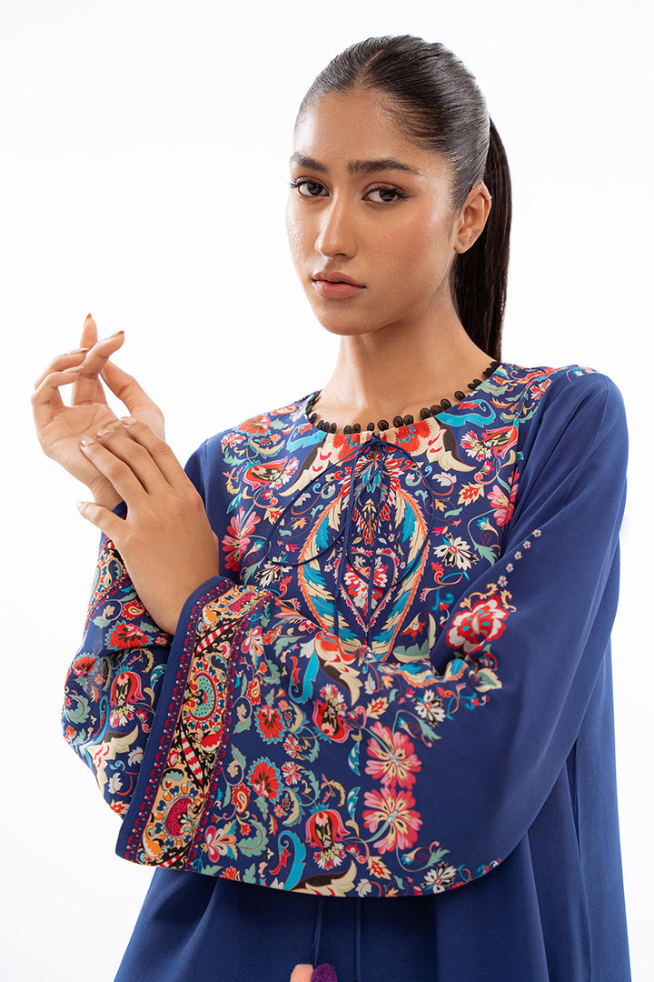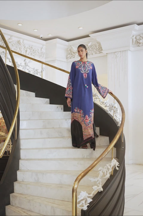 Our signature kaftan silhouete is cut from crepe in a navy blue hue and features intricate printed imagery with a contrasting black daaman.