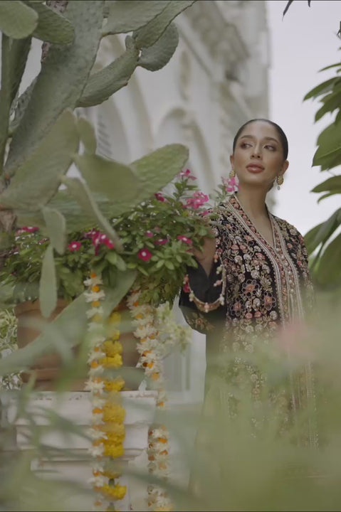 Adorn yourself this festive season in our sophisticated black velvet short jacket. The jacket is fully worked with zardoze and embroidered florals in pops of colour. The sleeves have delicate embroidered birds and tassel details that add a playful touch to the piece. This ensemble is paired with a gold tissue dhaka pajama.