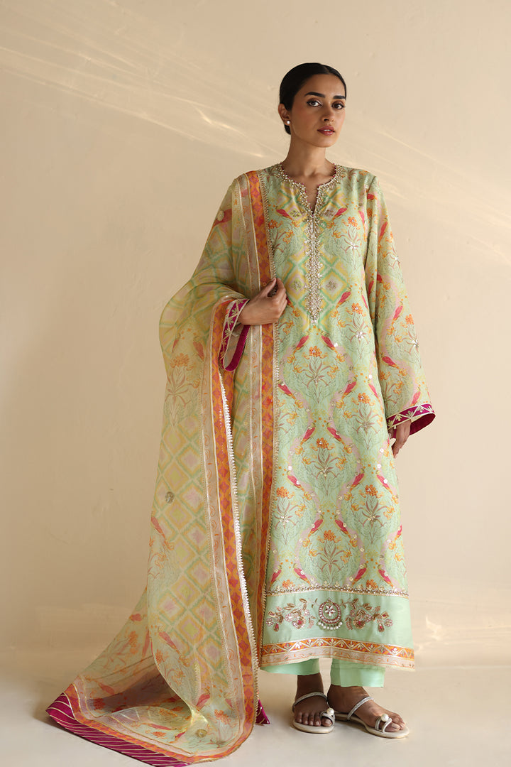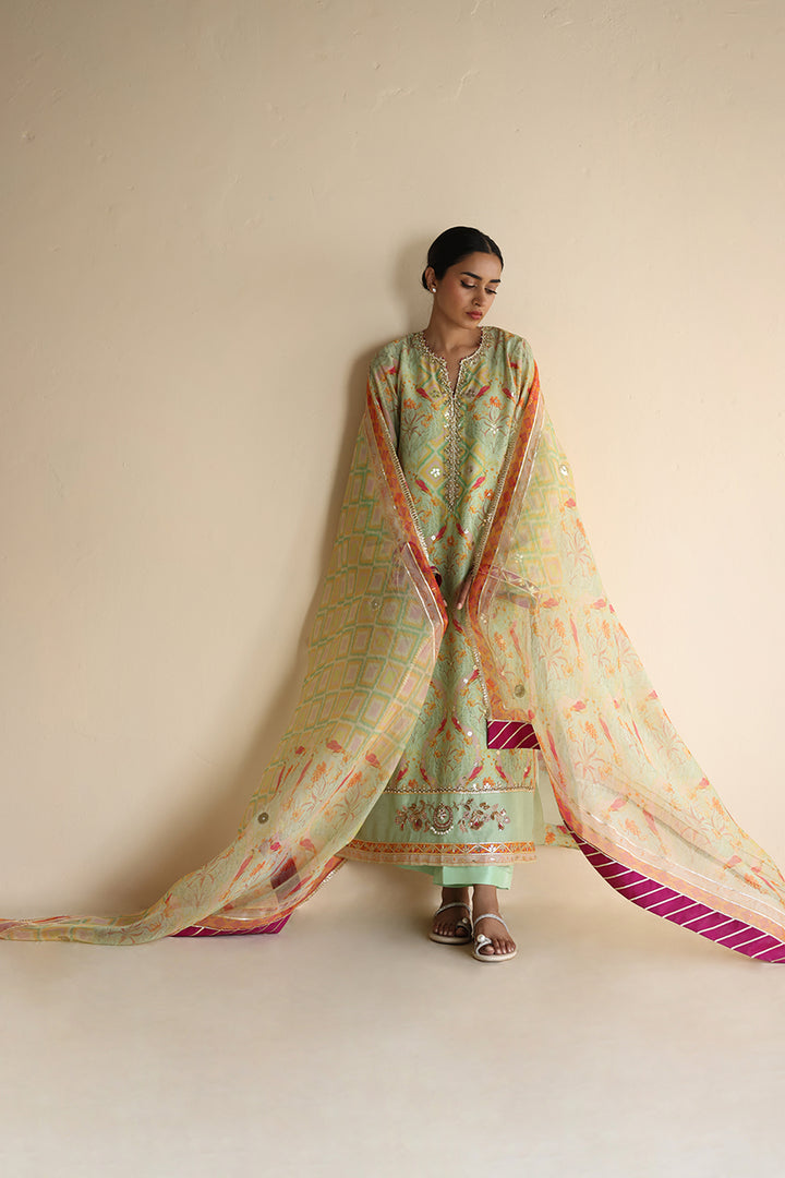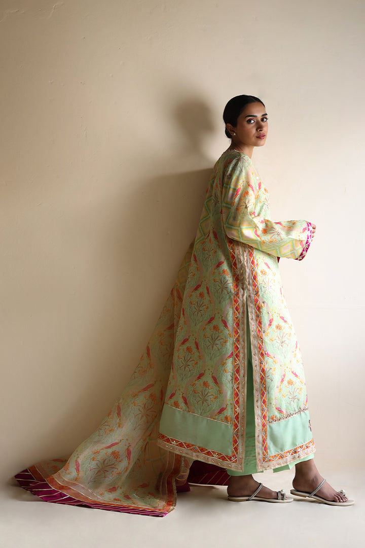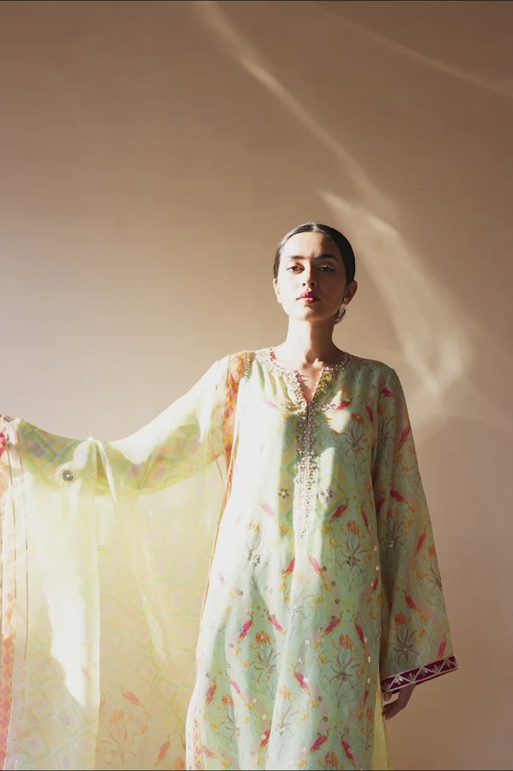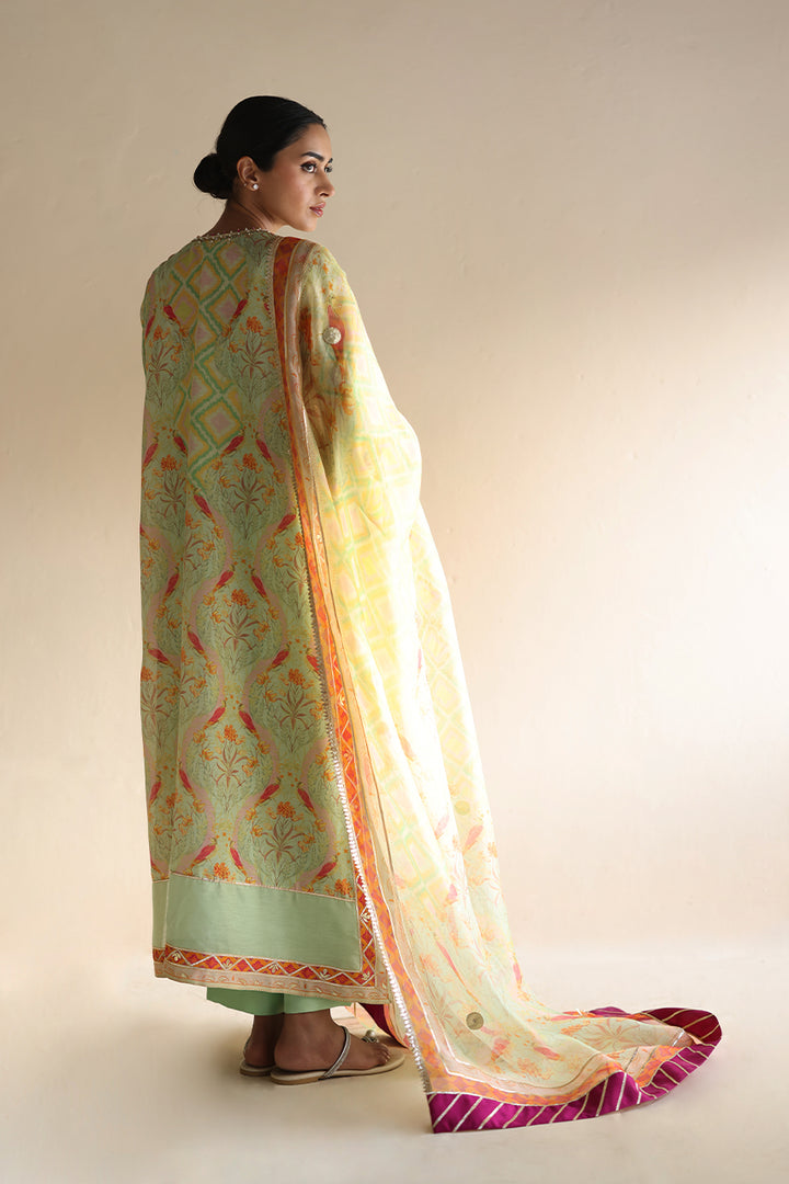 Basking in a soft mint hue, this khaddi silk A-line shirt is intricately printed with pastel toned florals and pops of tangerine avian motifs, lending it a lively charm. Zardoze and gota embroidery elevate the neckline and hem, with scattered gota accents along the flowing front. An organza dupatta featuring delicate patterns, bold fuchsia chatpatti accents, and gota detailing complements the relaxed silhouette, echoed on the sleeve hems. Paired with matching khaddi silk culottes, finished with pleats and subtle gota touches.