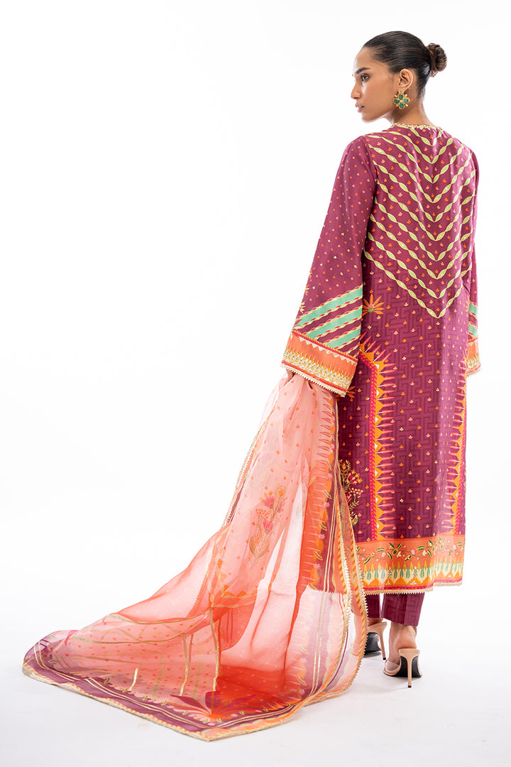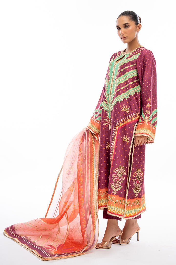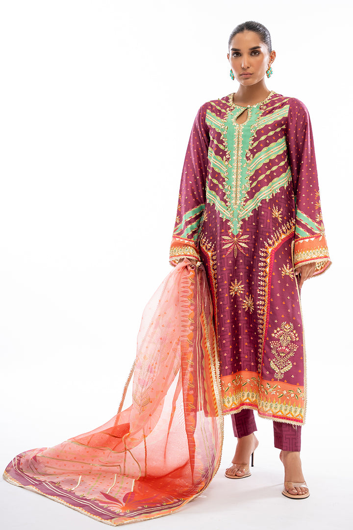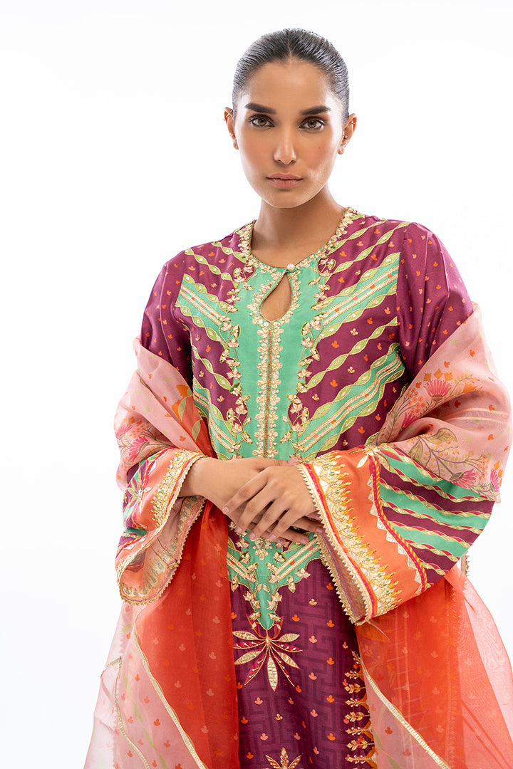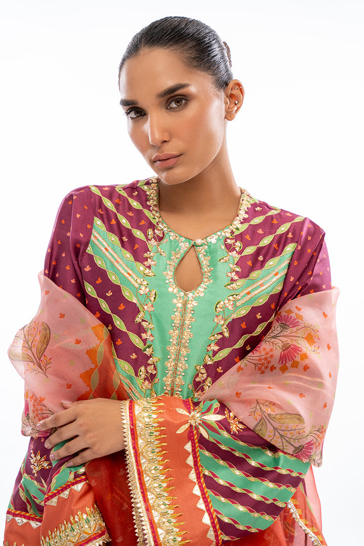 Adorn yourself in this festive ensemble, cut from mulberry rawsilk with a geometric canvas and printed motifs. The shirt is embellished with intricate gota work and features accents of mint green. A tangerine organza dupatta with gota finishing and matching trousers complete the look.