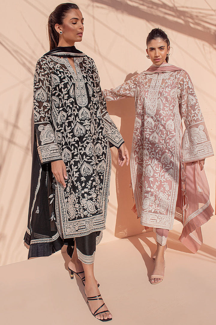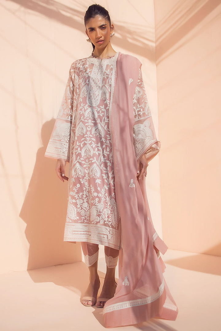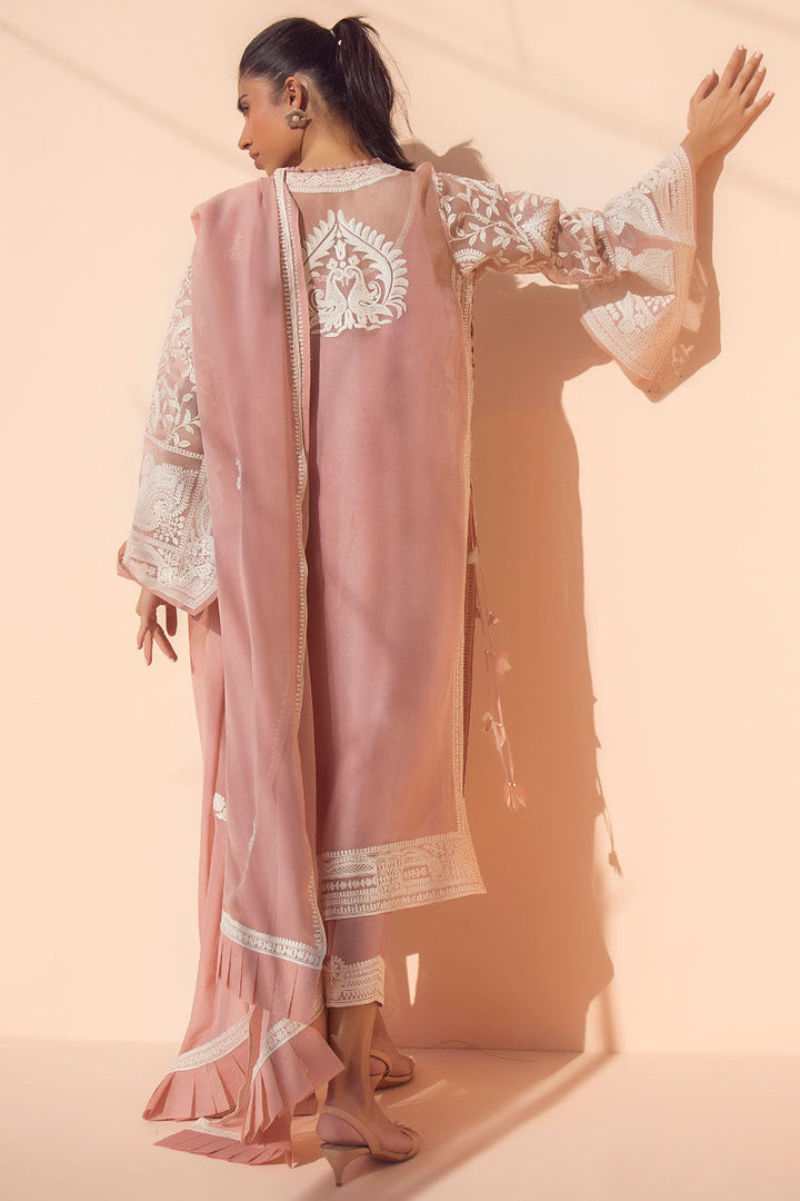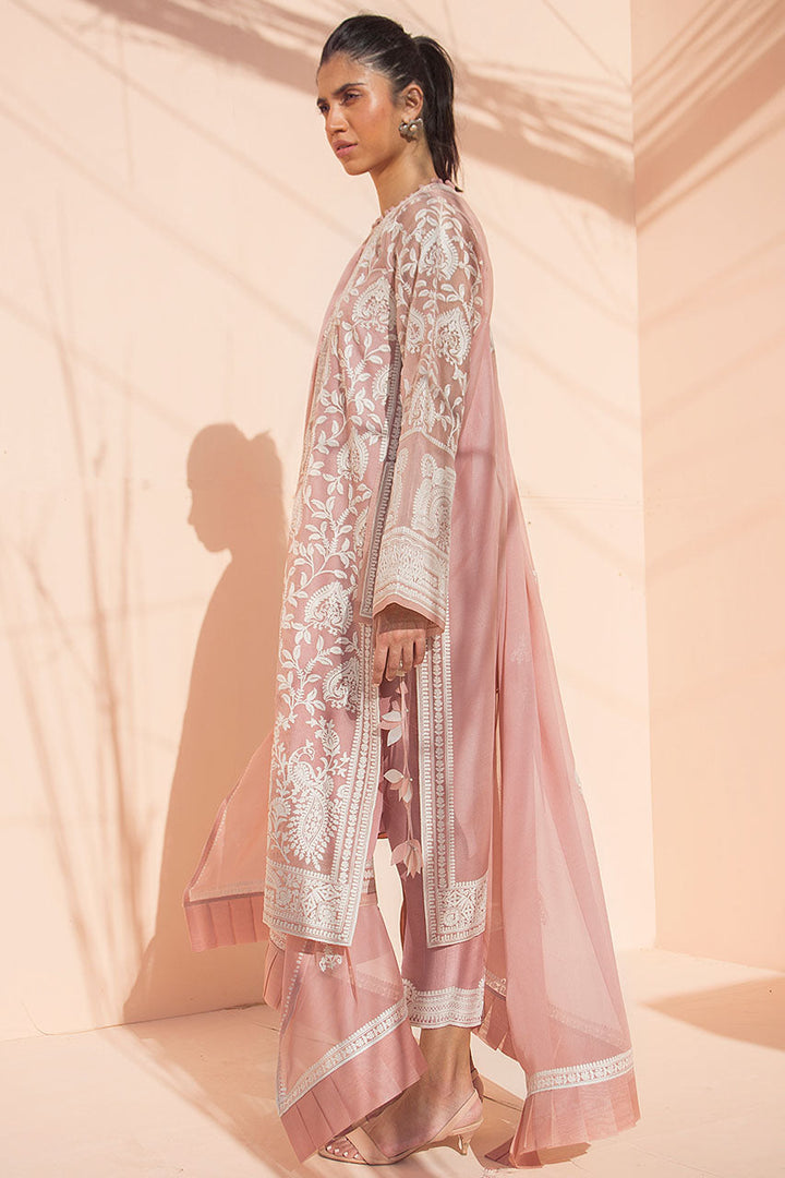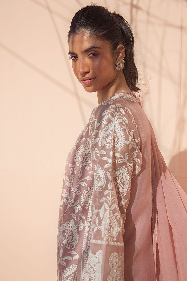 This baby pink organza shirt features delicate Aari embroidery in peacock and foliage imagery. Paired with a chiffon dupatta with embroidered borders and a raw silk izaar that is finished with intricate scalloped embroidery borders.