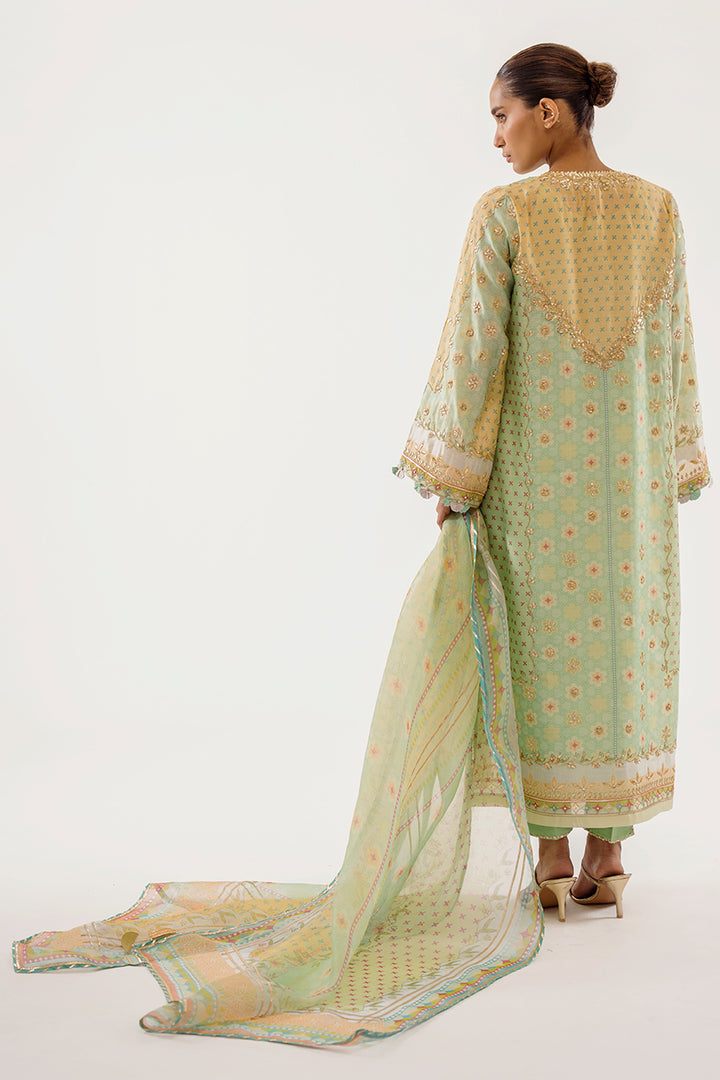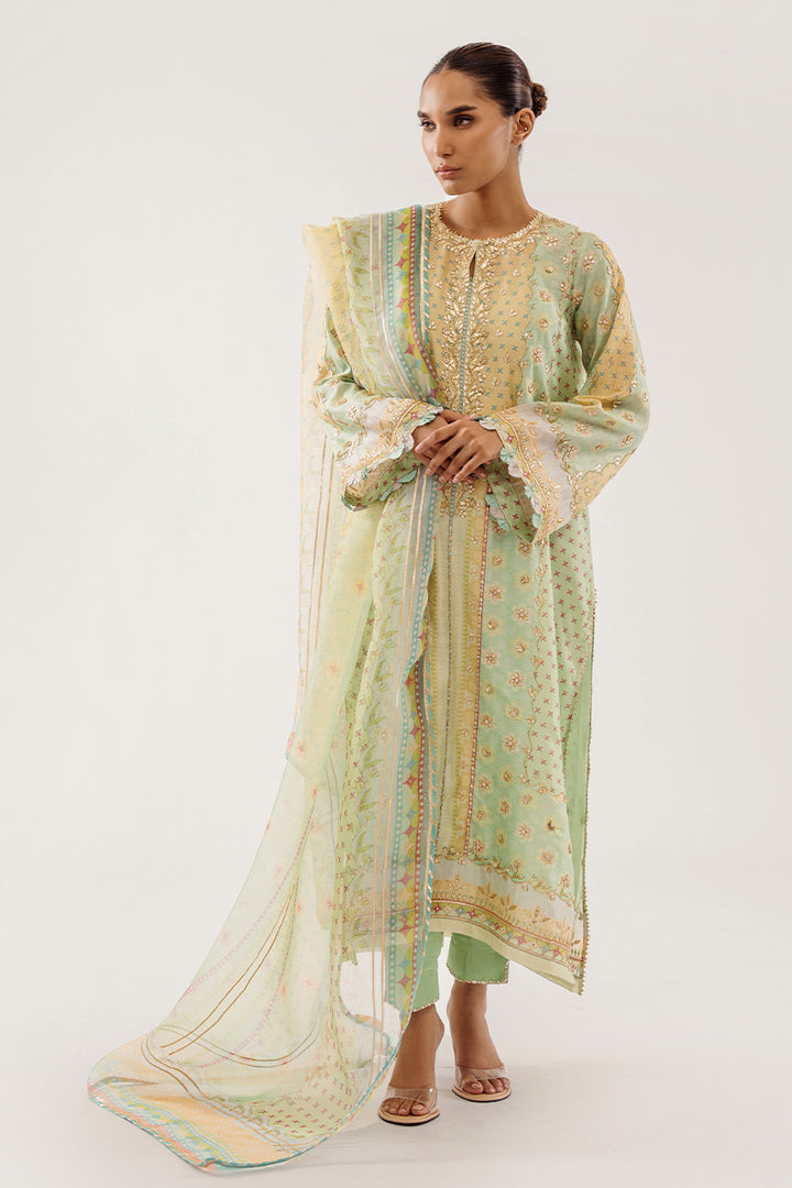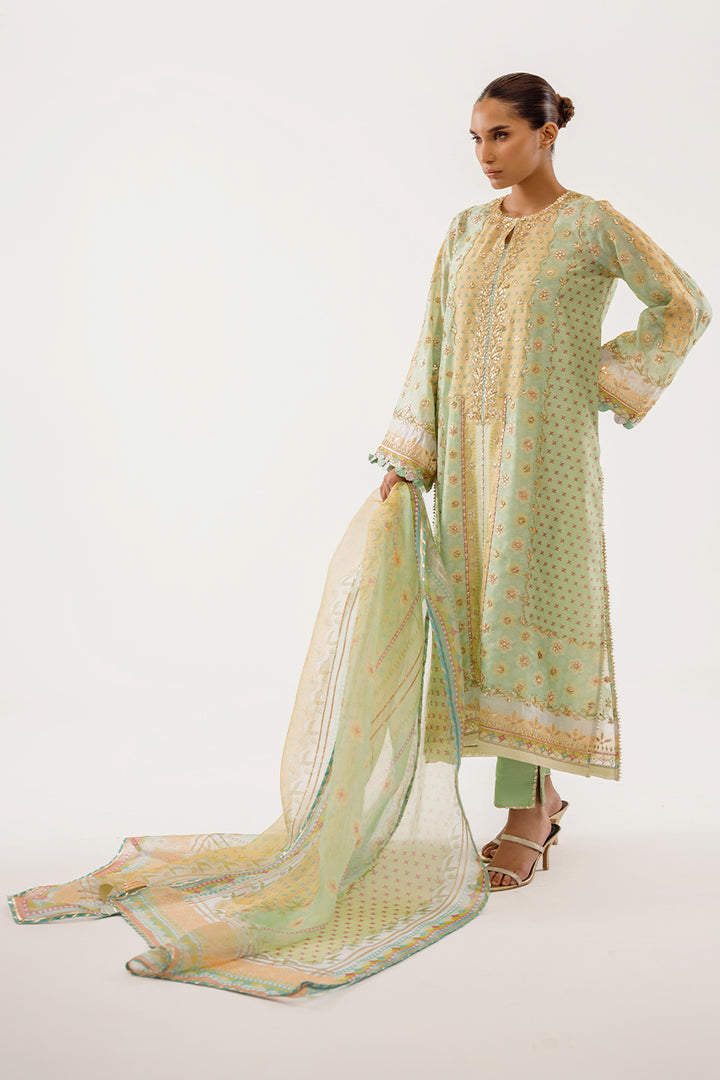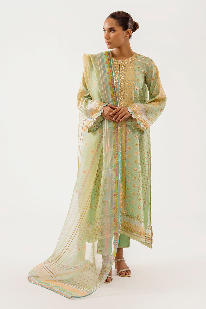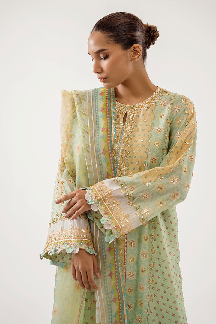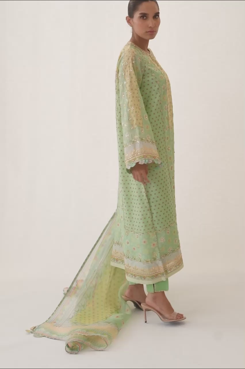 This playful printed khaddi silk shirt is an absolute must-have piece this festive season. It is rendered with hand-embellished gota detailing and vibrant multi-hued tassels accentuating the sleeves. Pair it with a matching printed organza dupatta to finish the look.