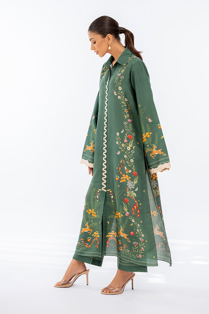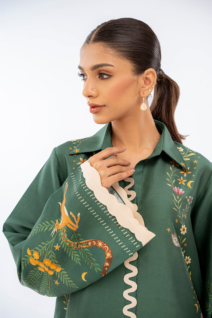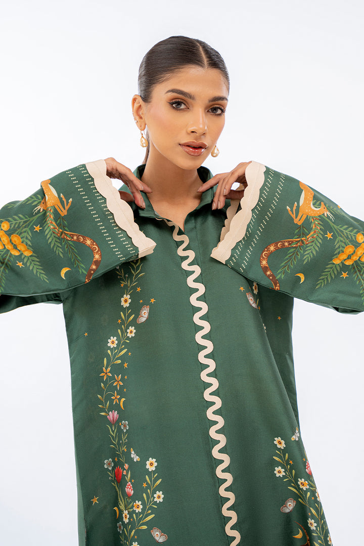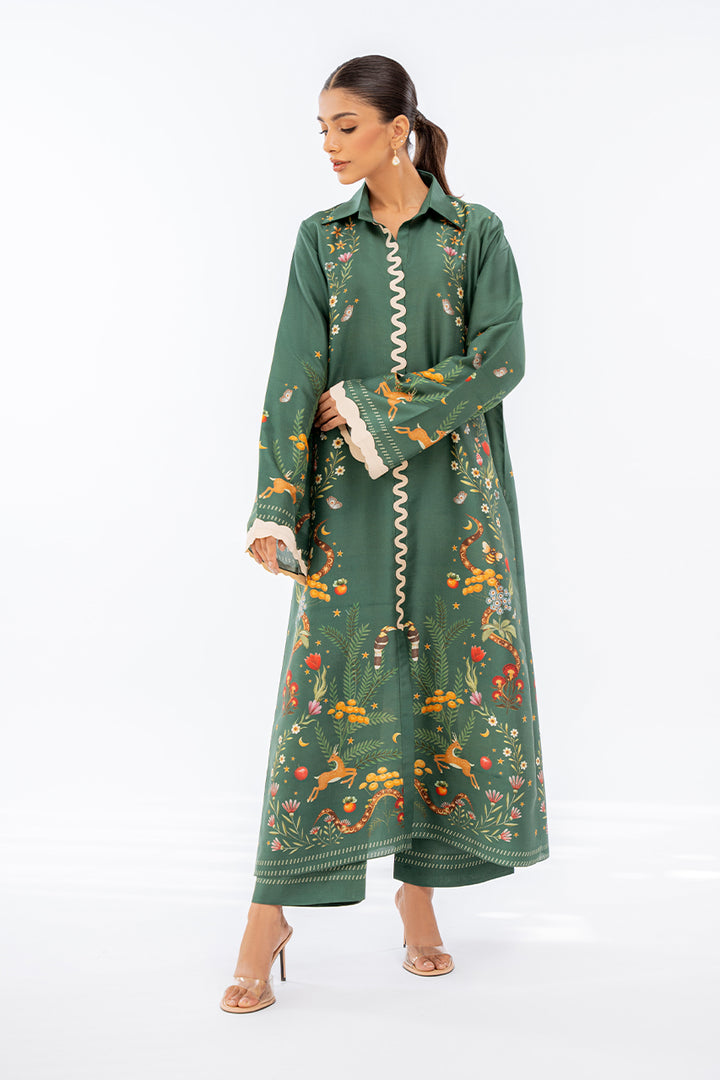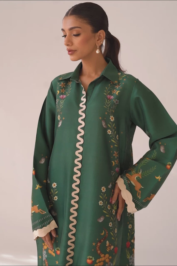 A pepper green hued digitally printed rawsilk kurta is paired with matching culottes and features playful imagery. Fabric manipulation details accentuate the neckline and sleeves.