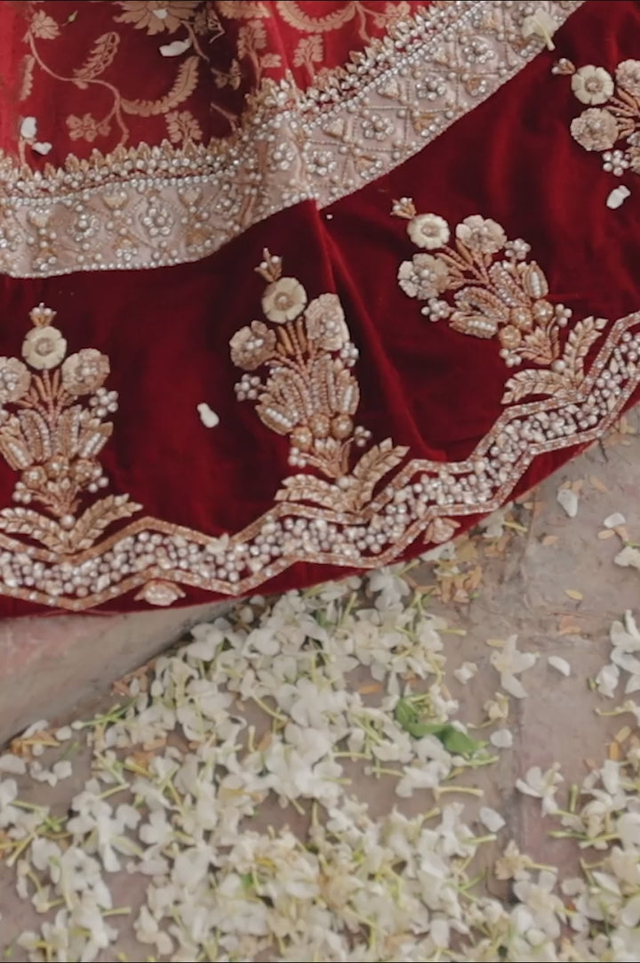 A gold heavily worked bodice cinched into a crimson cotton net peshwas exudes regality. The sleeves have bird motif and emerald bead detailing. The brocade farshi lehnga speaks to times bygone with its deep crimson pattern and velvet worked border. The rose gold tissue Dupatta is dispersed with chan and a heavily workd border that completed the bridal look.
