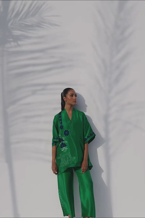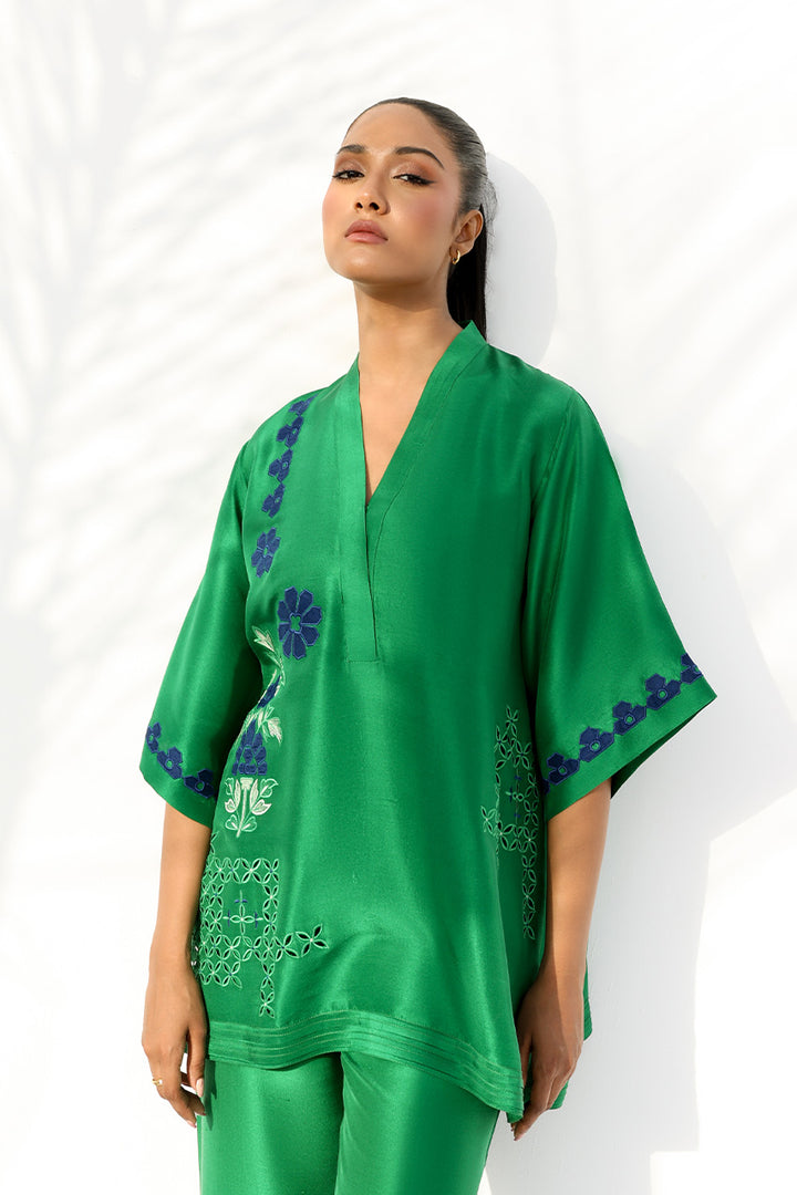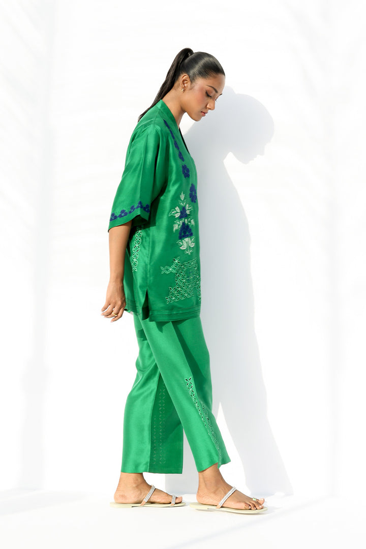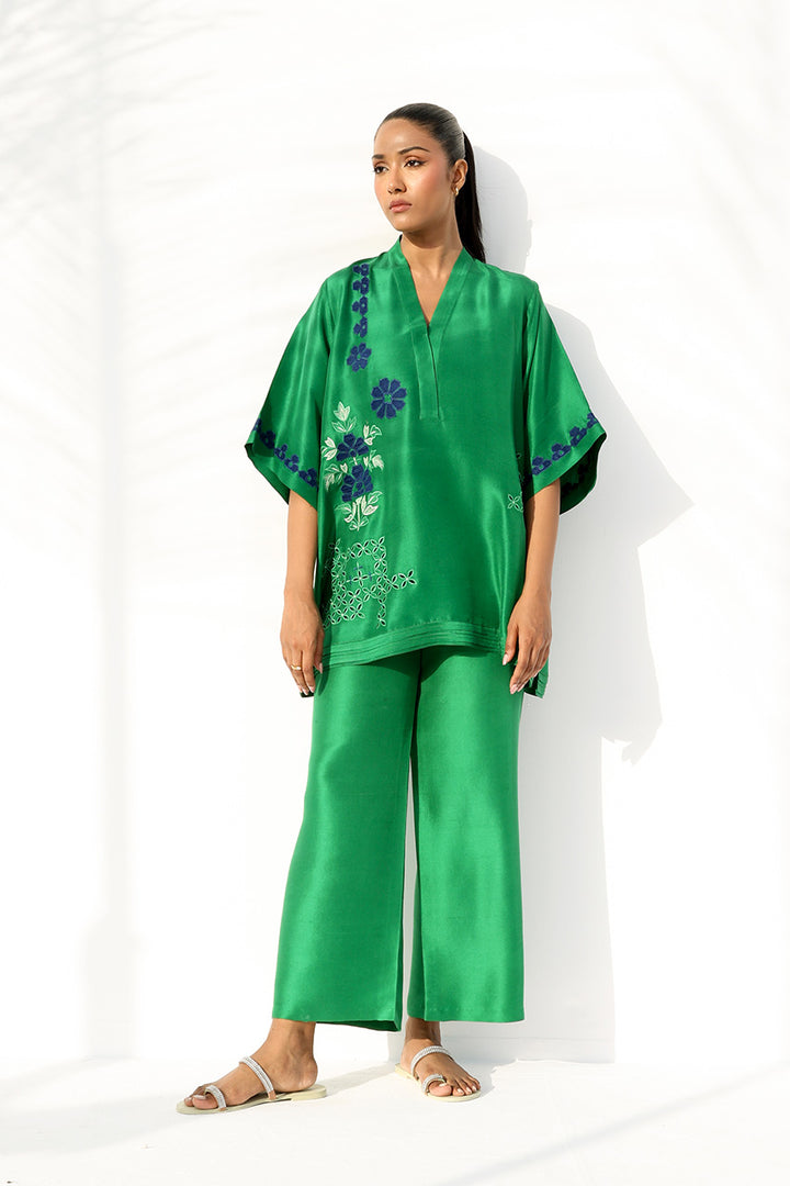Cast in a vivid jade pure Raw Silk, this contemporary co-ord set features a relaxed boxy top with a refined V-neckline. Intricate tonal and indigo floral applique and eyelet embroidery are artfully placed along the front asymmetrically and sleeves, adding depth and texture. Paired with sleek culottes, the look embodies modern ease with a touch of elevated artistry.