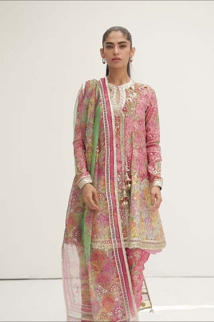 This short, aurora pink angarkha is the embodiment of a classy yet charming festive look. It is rendered with a thoughtful arrangement of zardoze and gota work on a floral-printed khaddi silk, featuring a chatapatti border. A multi-coloured dupatta with gota finishing and a printed shalwar add the final touches to this ensemble.