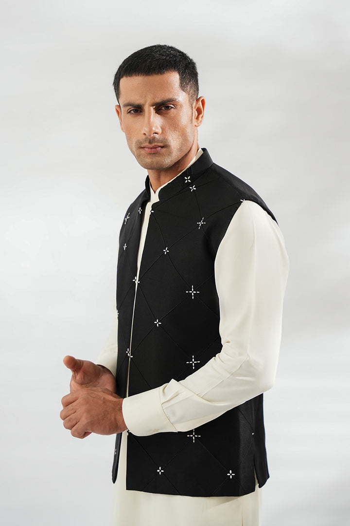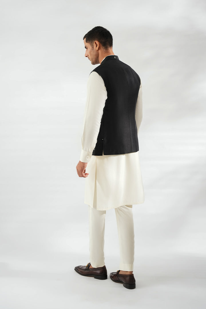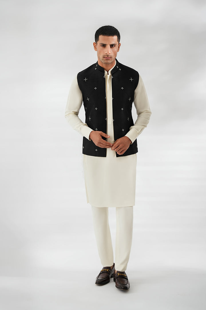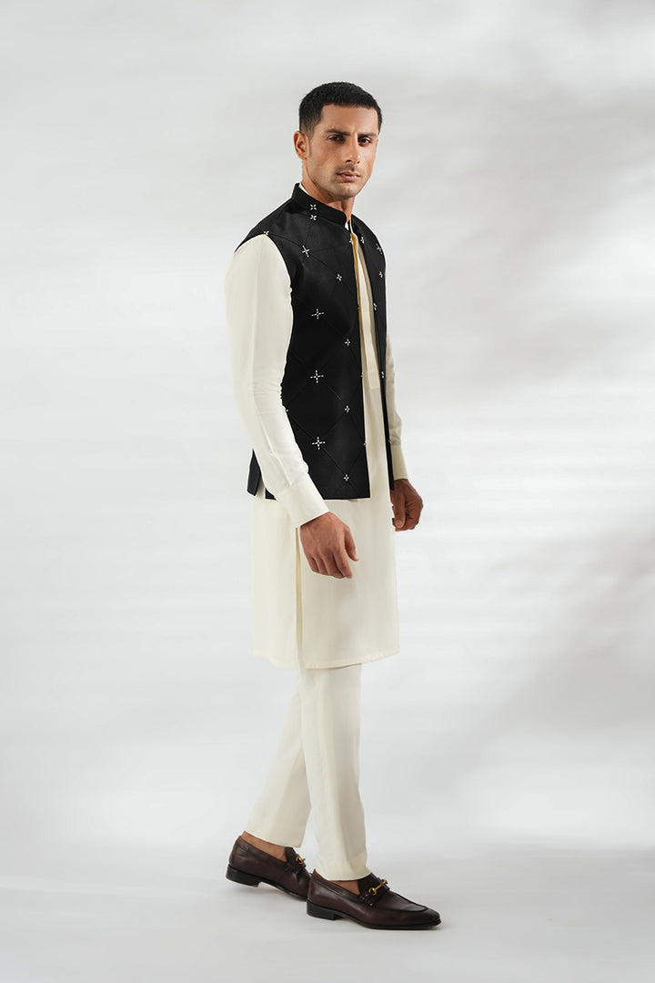 An ivory boski kurta with a concealed placket is layered with an ebony waistcoat, embroidered in geometric motifs that lend a contemporary edge. Coordinating ivory Boski pants completes the ensemble with understated elegance.