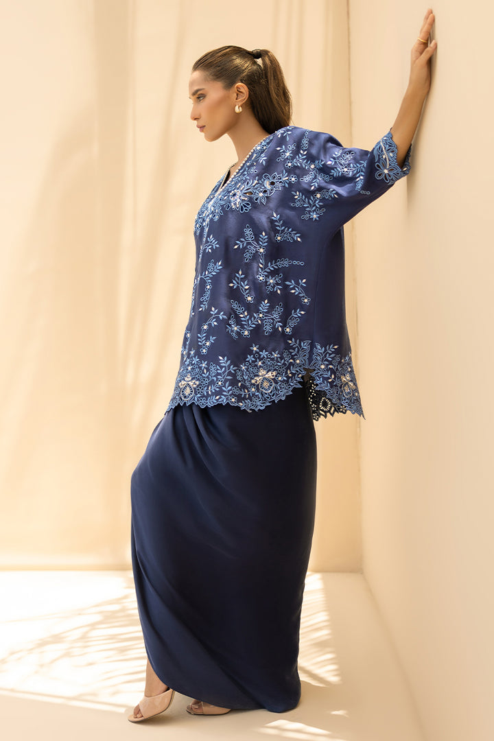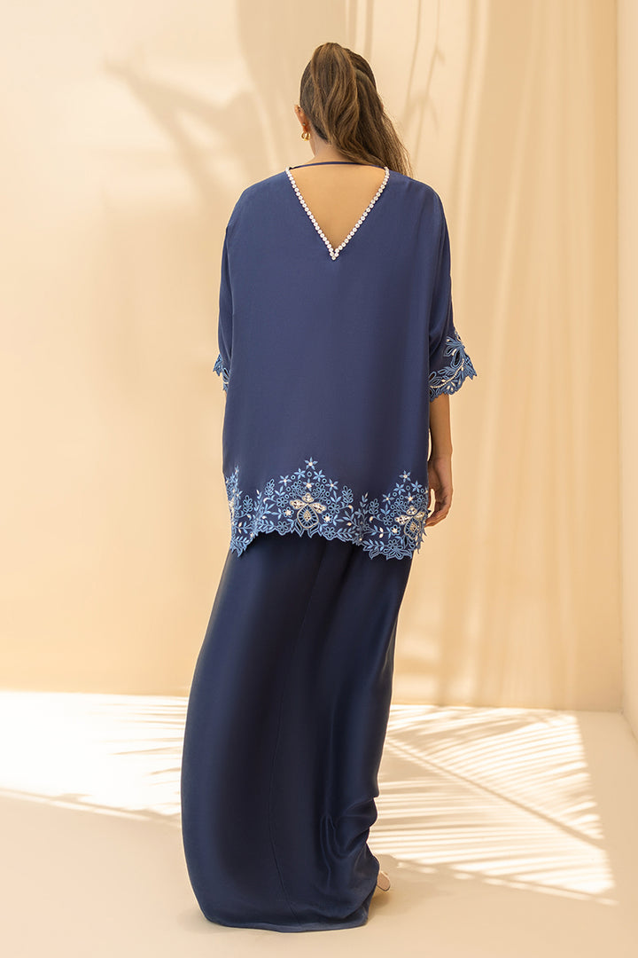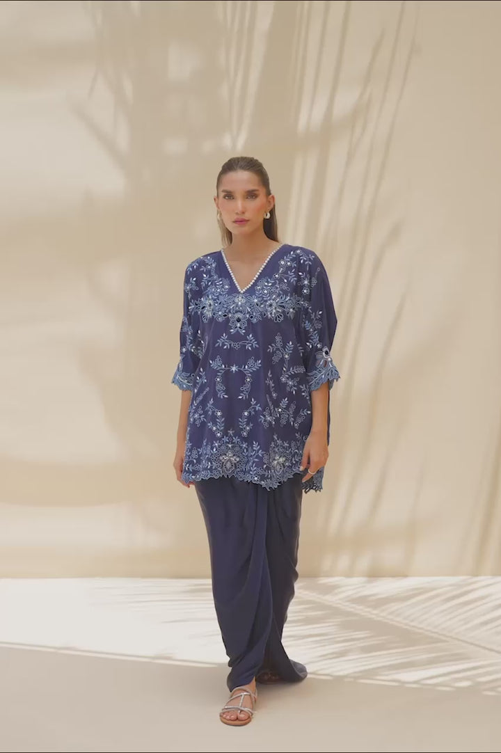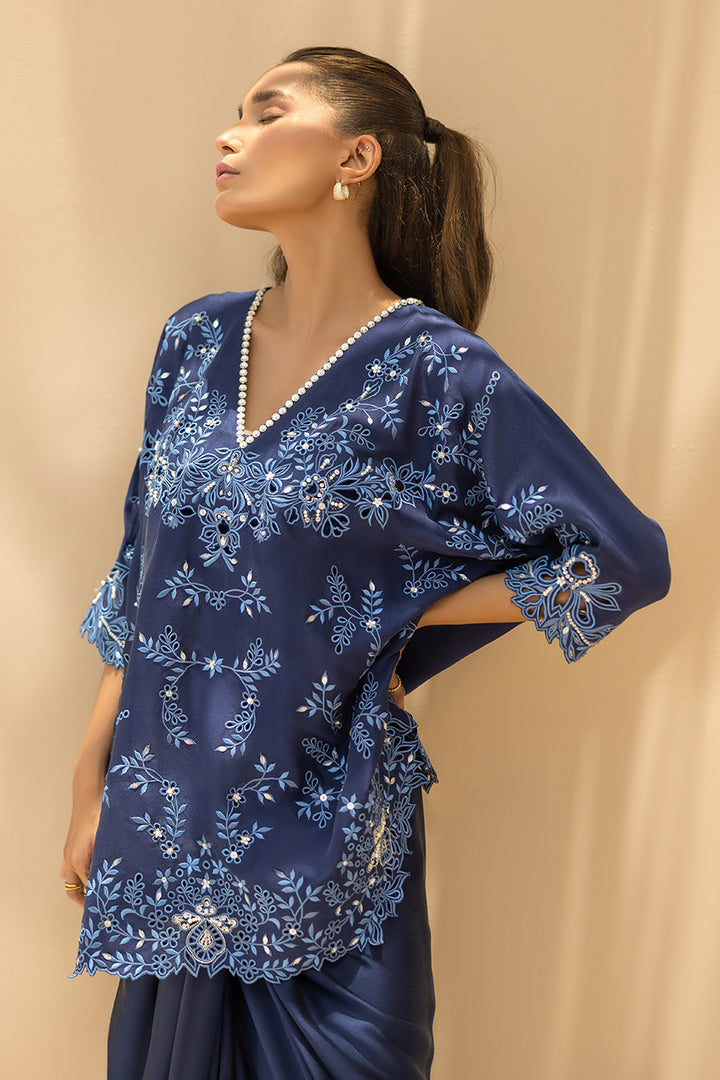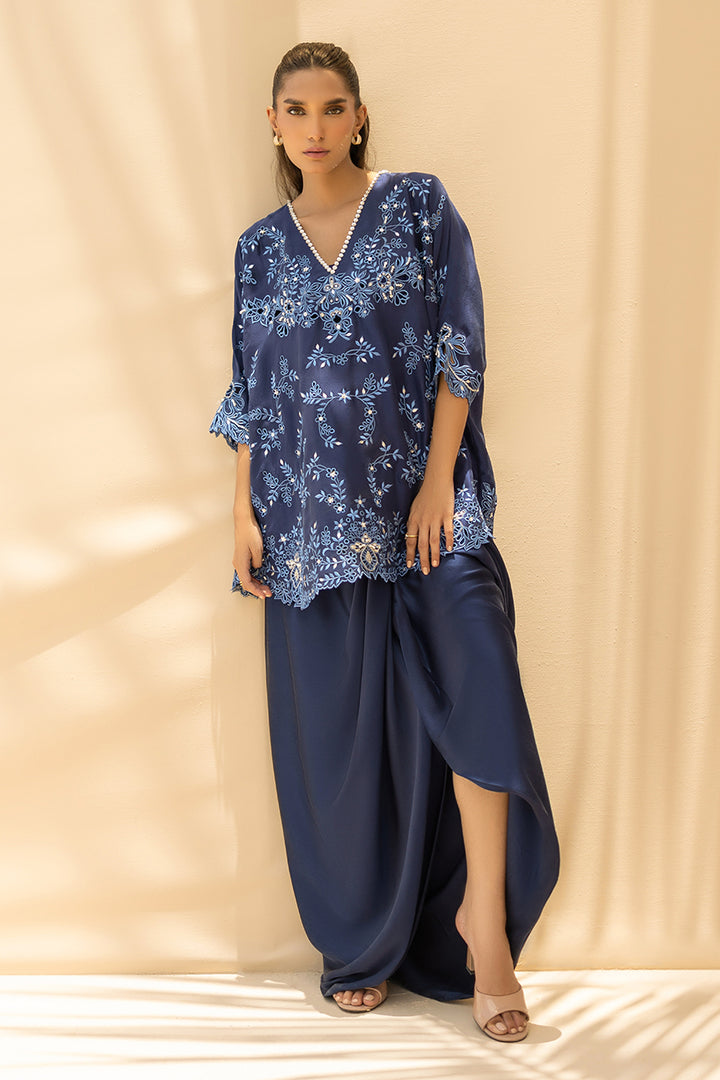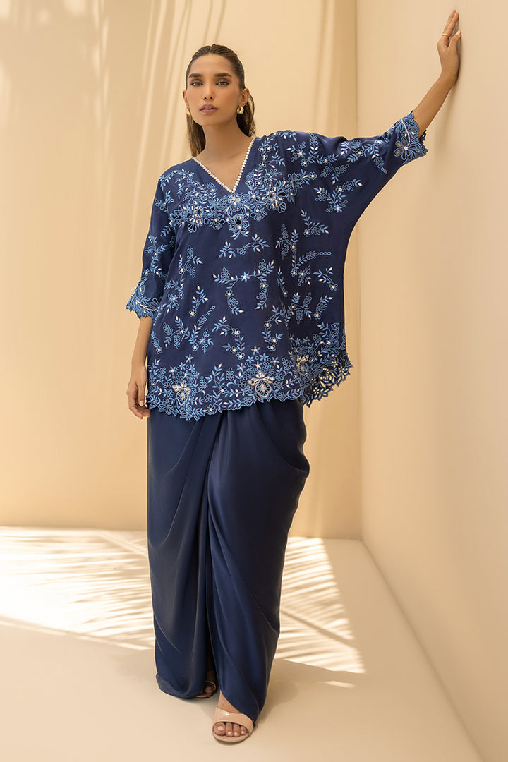 In deep midnight blue rawsilk, a relaxed silhouette unfolds with azure resham florals and eyelet details, its neckline traced with hand embellished sequins. The hem and sleeves bloom with cutwork embroidery, softening the fluid form. A draped asymmetrical skirt in matching lustrous charmeuse grounds the look, its sculptural folds creating movement and presence.