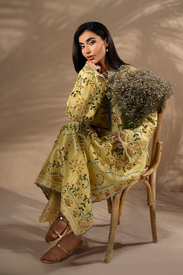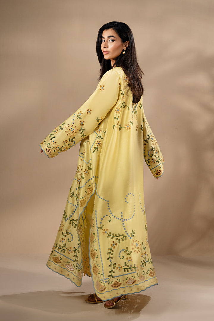 Bathed in a soft lemon glow, this pure rawsilk kaftan flows with tonal and contrast resham eyelet embroidery, its scalloped edges and cutwork mesh dancing along the sleeves, slits, and hem. A powder blue appliqué traces the V-neckline like a whisper. Paired with laser-cut culottes, it’s a portrait of quiet elegance.