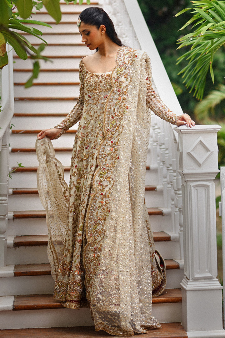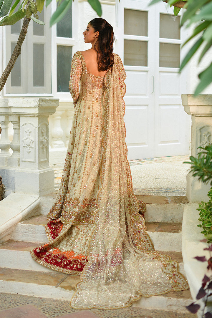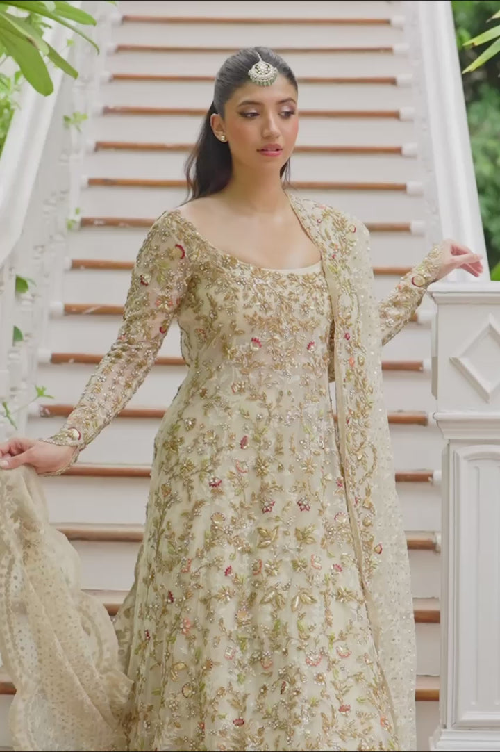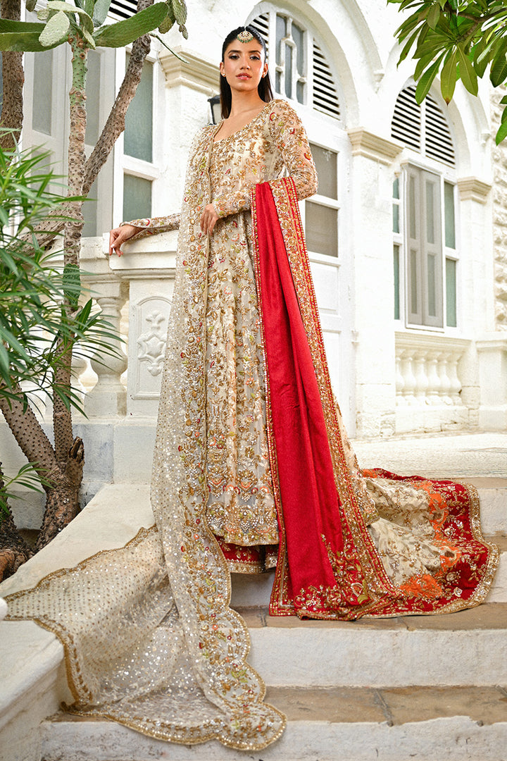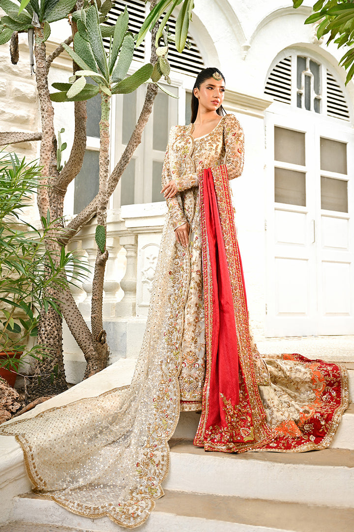 Delivery 4-6 MonthsThis bridal ensemble is imagined on a soft ivory base, lavishly worked with resham, sequins, pearls, and zardoze in gold with pops of colour. The French tulle peshwas flow in a grand silhouette, its panels alive with intricate embroidery that extends into a voluminous lehenga beneath, layered over a pure raw silk tube top. The matching brocade lehenga is finished with striking chatapatti borders that lend depth, dimension, and traditional artistry to the look. It is styled with a diaphanous French tulle dupatta encrusted with crystals and scalloped borders, paired with a richly embroidered crimson shawl crafted from self-jamawar and detailed with gold thread and ornate edging.