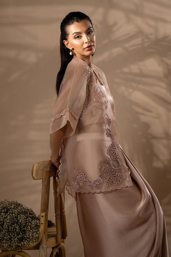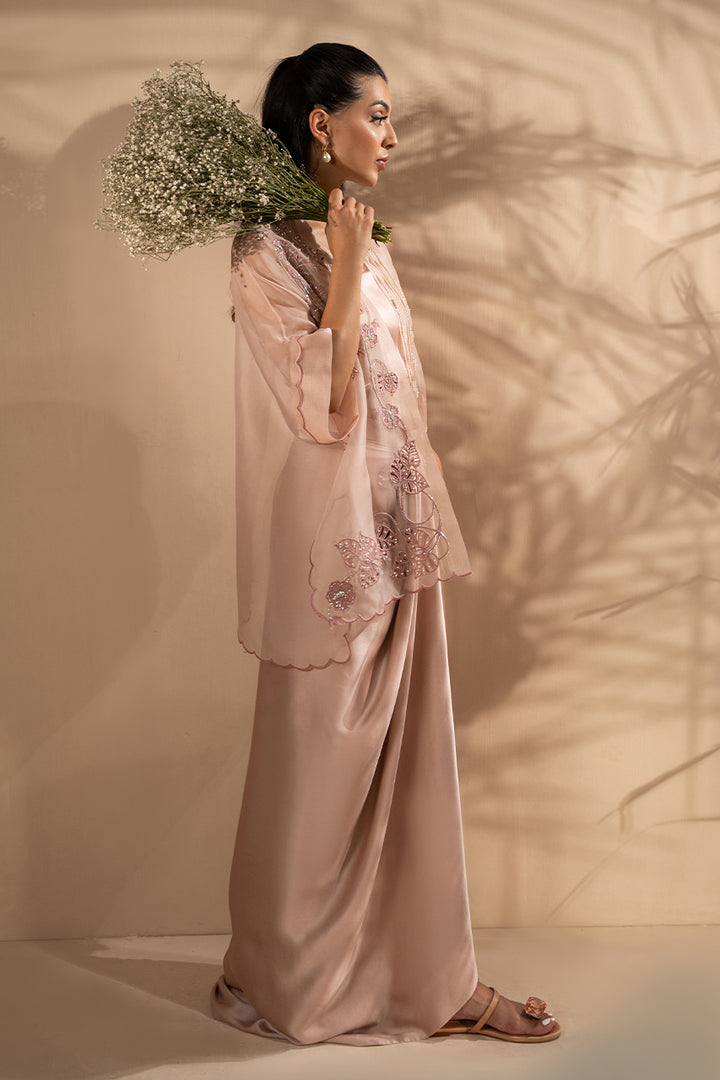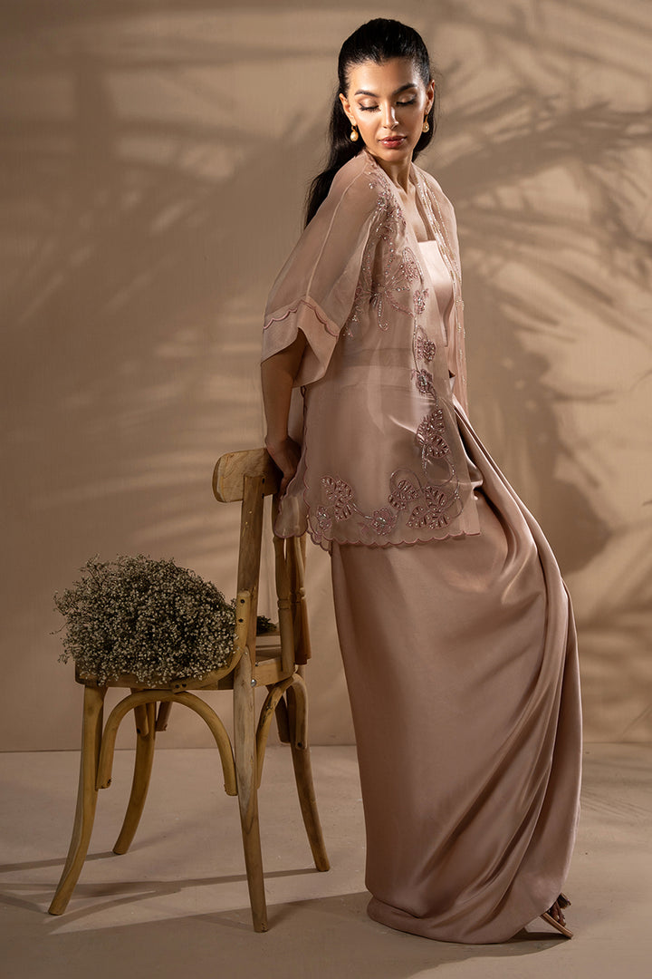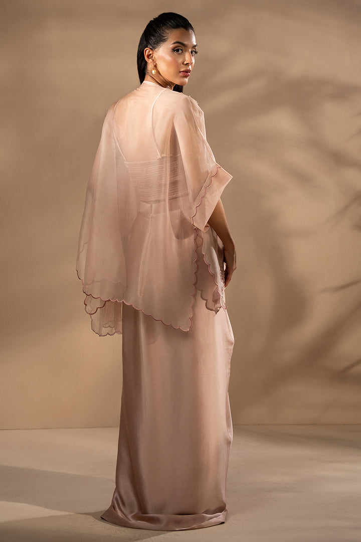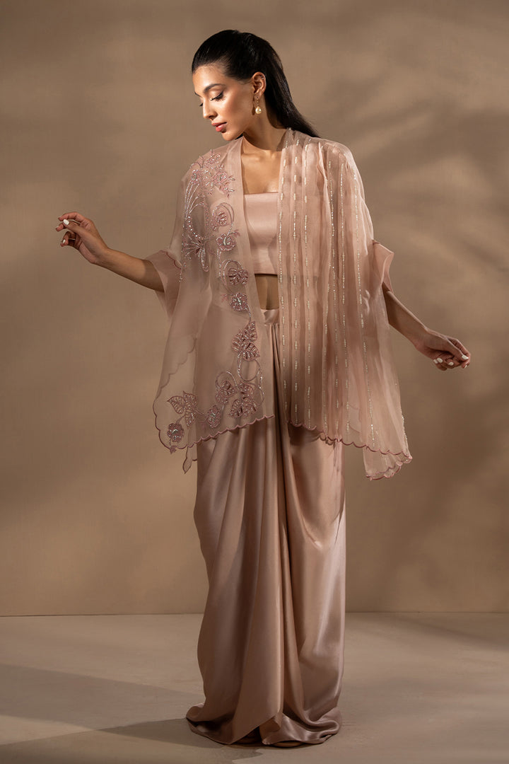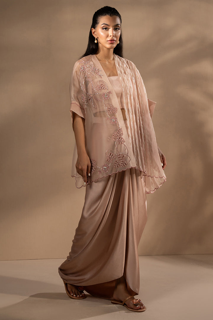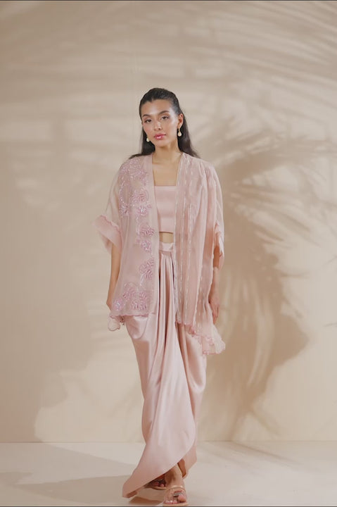 An edgy ensemble in blush, featuring a charmeuse tube top paired with a fluid draped skirt in the same lustrous fabric. It is layered with an asymmetrical statement organza jacket, adorned with tonal hand embroidery on one side and fabric manipulation on the other, its scalloped edging exuding sculptural grace.