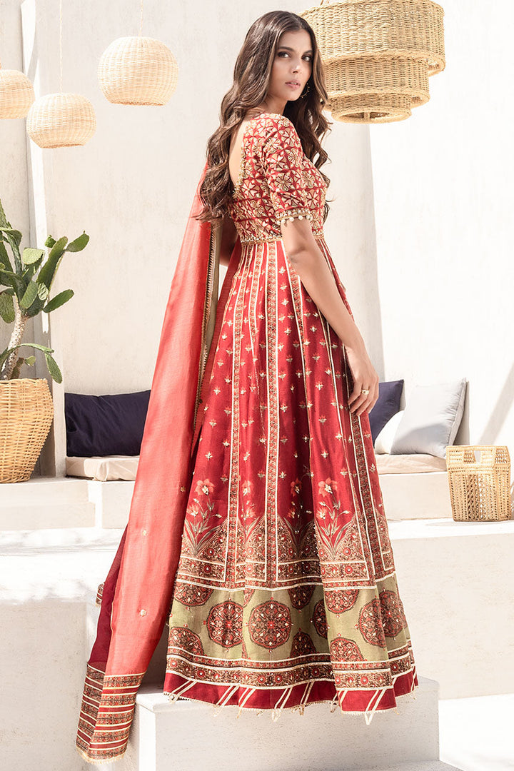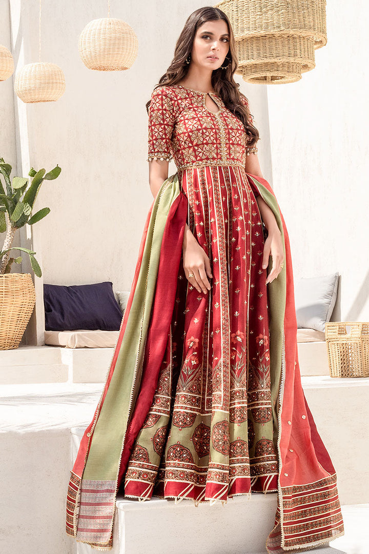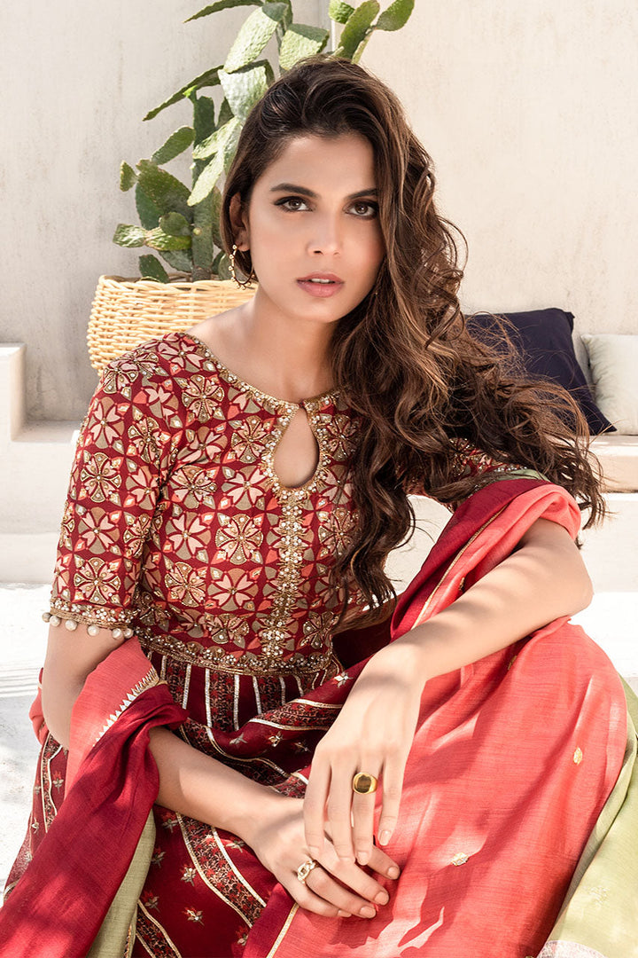 A long printed paneled cotton net peshwaas with a geometric worked bodice the whole piece is finished with beautiful zardoze and gota work to elevate the piece. The khaddi silk dupatta is in two tones fresh grass green and deep burgundy.