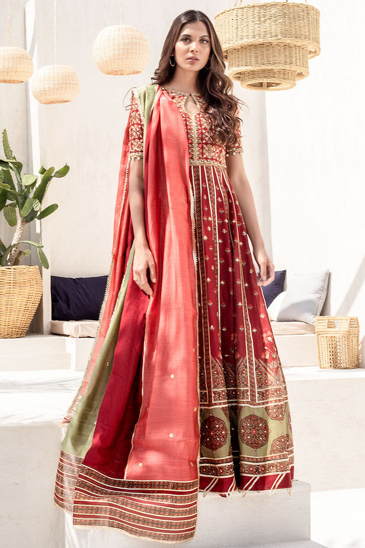 Burgundy Printed Long Peshwaas With Zardoze And Gota Work And Two-Tone Khaddi Silk Dupatta