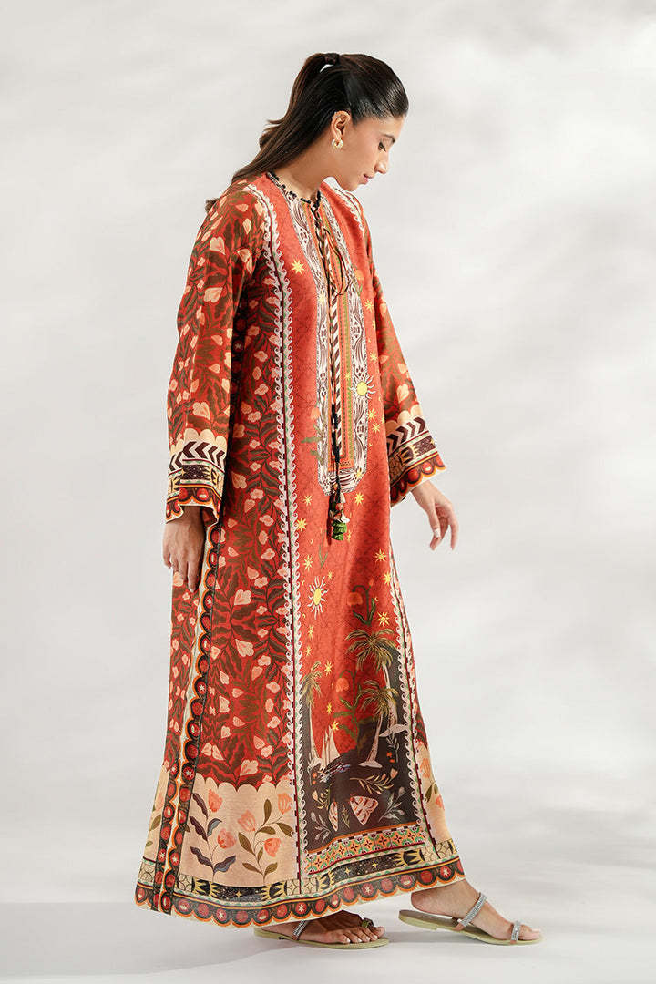A canvas of scenic artistry, this cotton net kaftan is adorned with a picturesque print of tranquil boats drifting across painted waters. The rounded neckline is accentuated with resham tassels that sway playfully, adding movement and charm to the flowing silhouette.