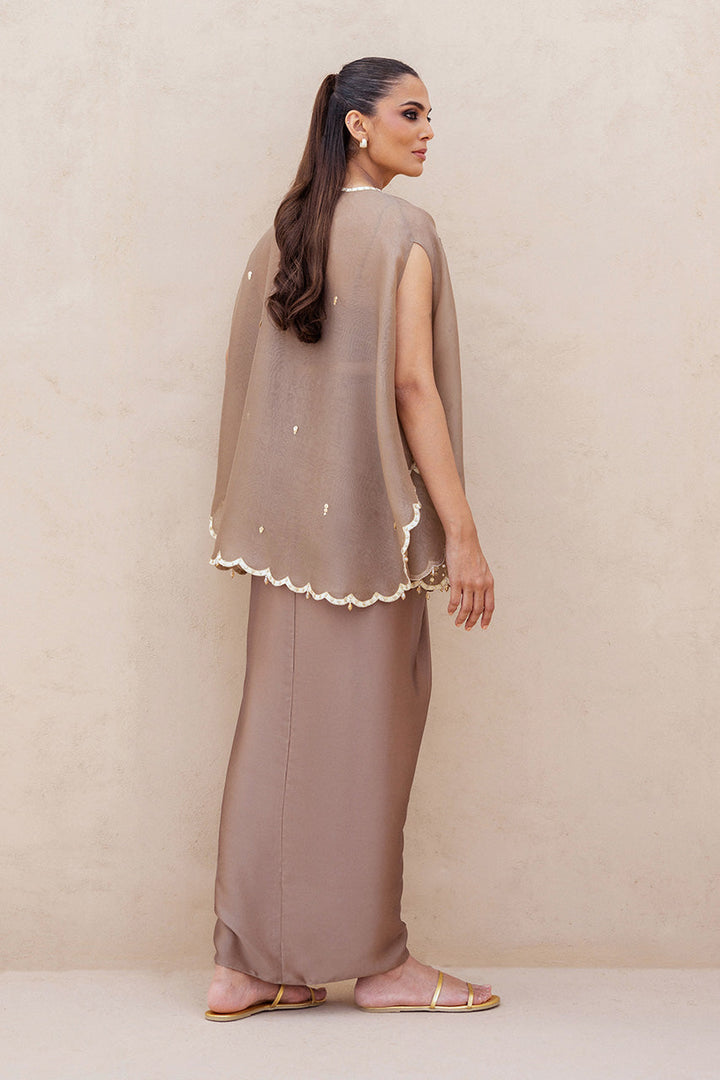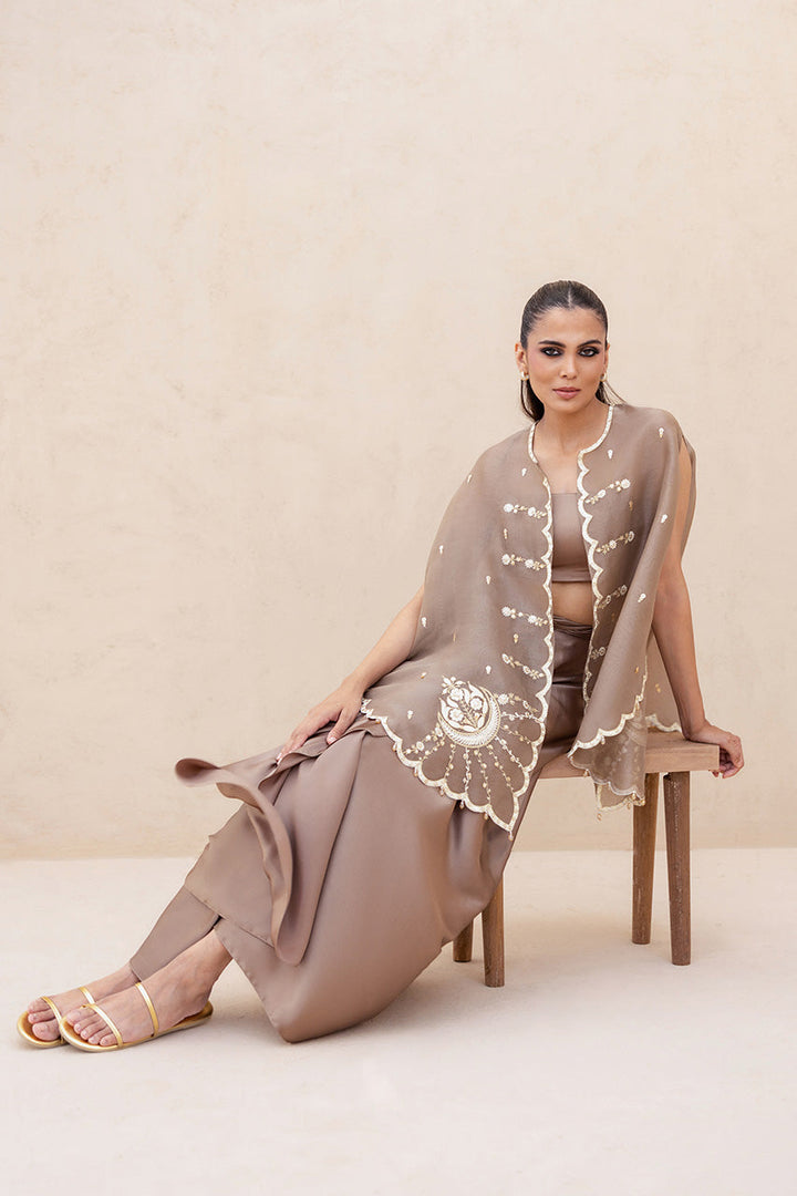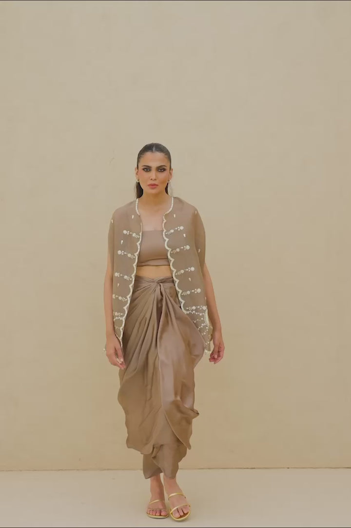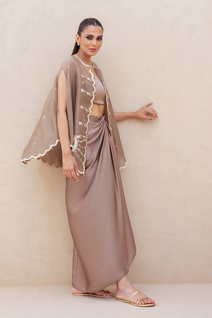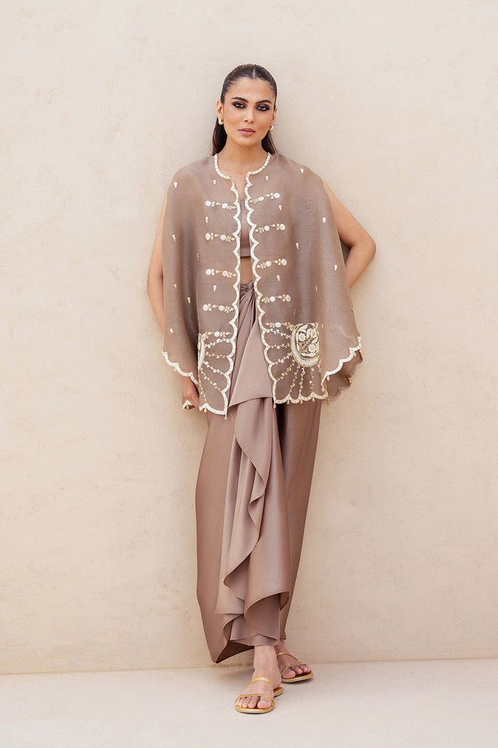An ode to modern femininity, this ensemble is rendered in a copper rose hue. The sleeveless organza cape, delicately scalloped, is adorned with ivory aari threadwork, dainty marori florals, and zardoze kissed embroidered vines, its fluid fall echoing quiet luxury. Beneath lies a matching charmeuse tube top, paired with pre draped charmeuse skirt that gathers into sculptural folds.