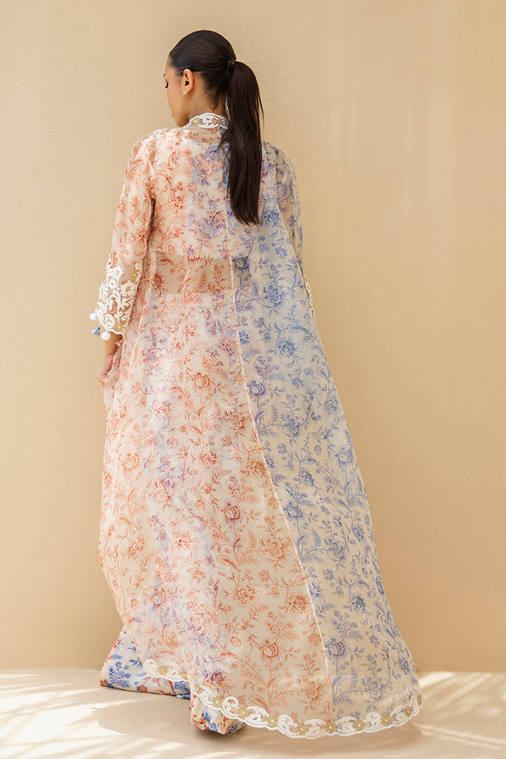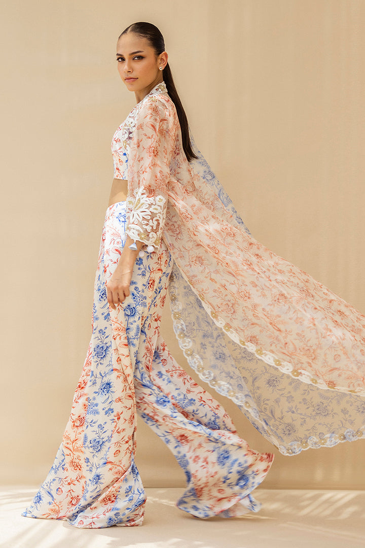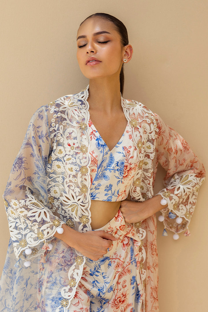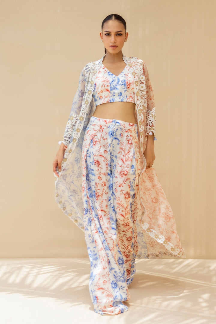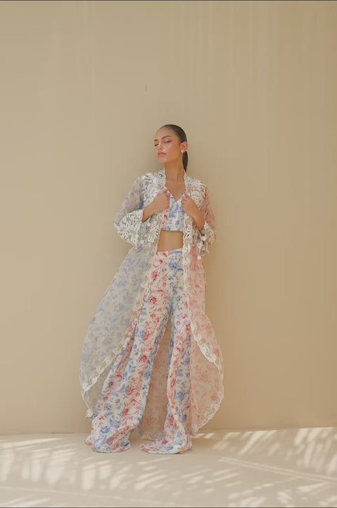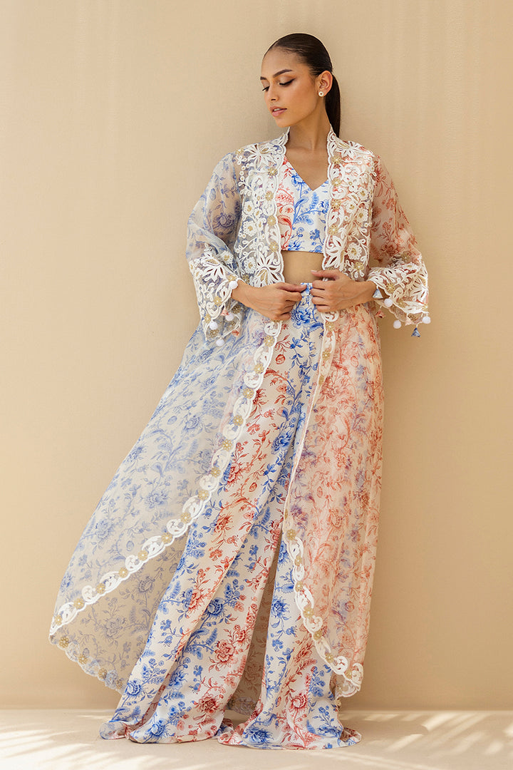 A symphony of ivory, deep coral and cobalt hues, this three piece ensemble speaks with quiet poetry. The charmeuse bralette is adorned with a chinoiserie inspired print, color blocked in coral and cobalt stripes. Wide leg palazzos mirror the motif, flowing in airy charmeuse with painterly romance. Draped atop, a sheer organza jacket, half alive with cobalt blooms and half with coral vines, is edged in ivory aari embroidery and scallops, creating a vision of timeless luxury.