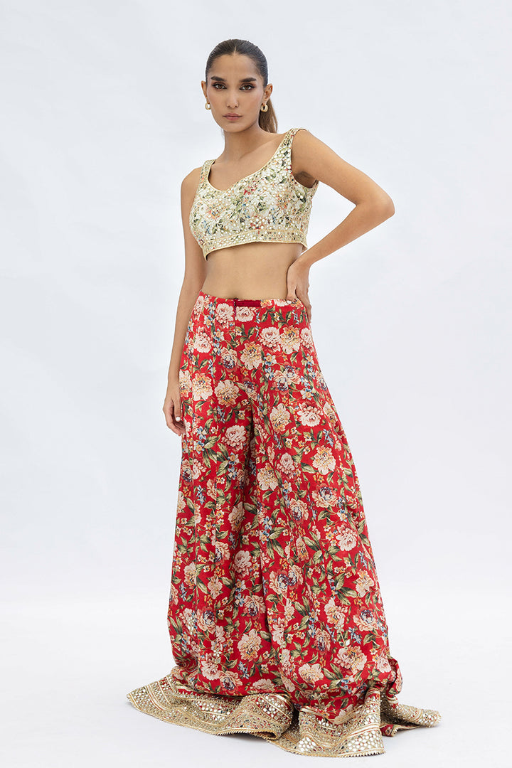 In rich tones of burnt orange and earthy hues, this ensemble combines tradition with contemporary ease. The sheer organza jacket, patterned with painterly florals, is edged with intricate gota and mirror embroidery that frames the neckline, cuffs and borders. It is paired with a fully embellished printed khaddi silk tube top, while a khaddi silk dhaka pajama carries the same botanical print, its borders richly adorned with embellishment for an effortless yet resplendent finish.