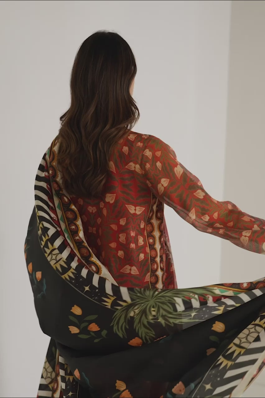Storytelling is translated through print in this ensemble, blending burnt orange, ebony, and earthy tones into a striking tapestry of heritage and modernity. The flowing silhouette is enriched with intricate patterns inspired by nature and folklore, while a statement ebony-hued medium silk dupatta showcases playful elements on its border and magnified tropical motifs on the pallu. It is paired with matching burnt orange pure rawsilk trousers.