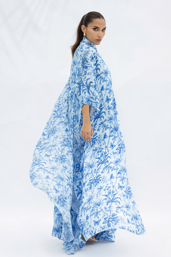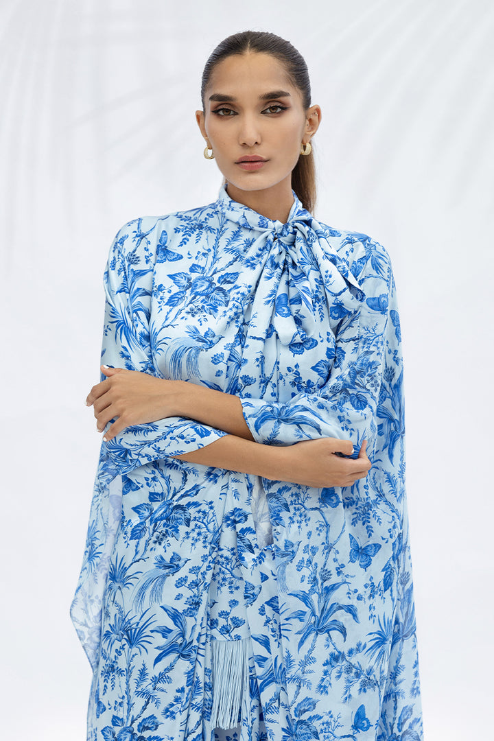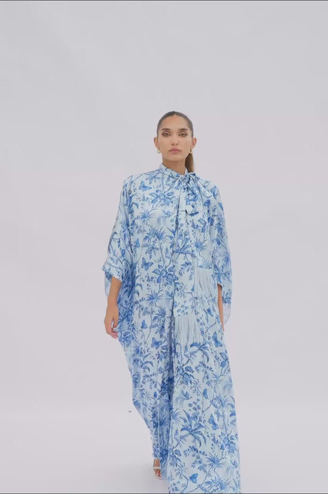 A portrait of effortless style, this sky blue and azure charmeuse kaftan is adorned with painterly foliage motifs inspired by hand painted chinoiserie and layered with a matching sheer georgette overlay. The neckline is gathered into a sculptural bow with delicate fringe that sways softly, creating a seamless canvas where print and form move in quiet harmony.