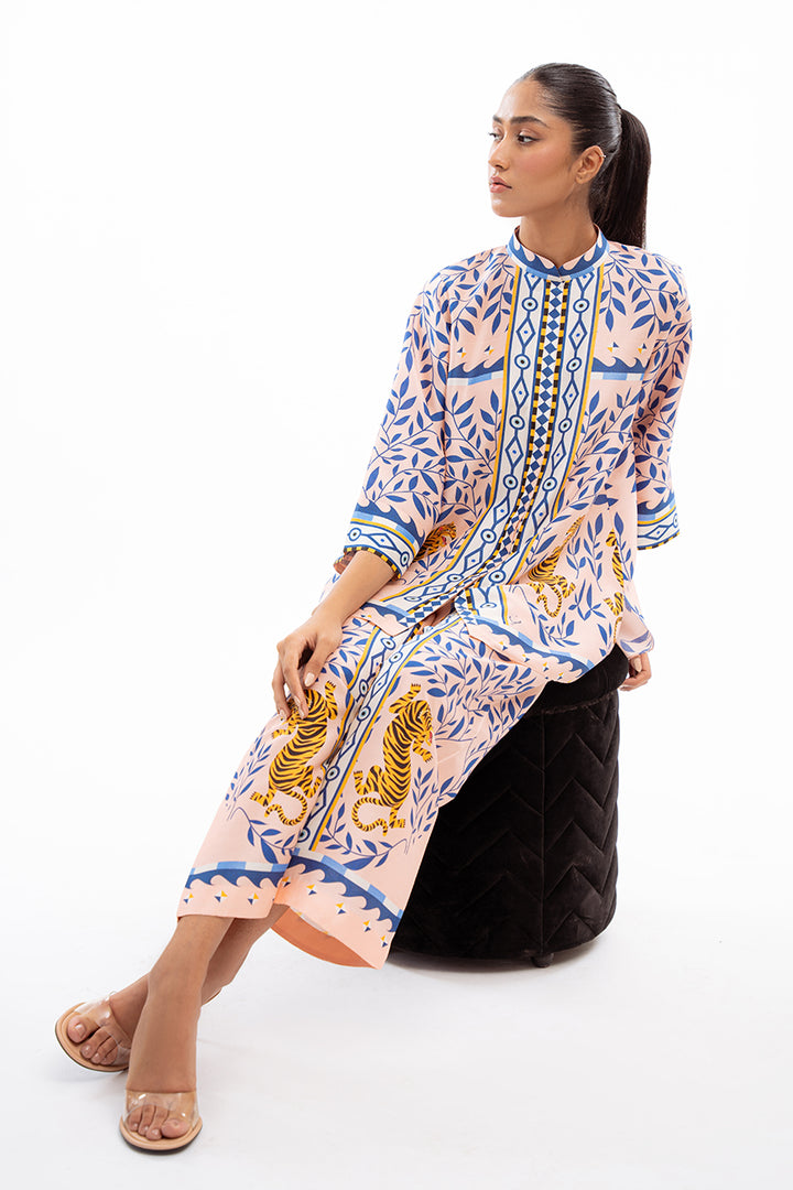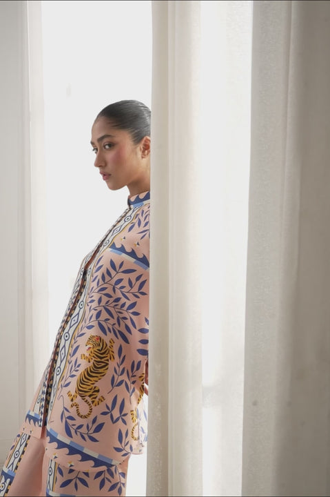A salmon coloured co-ord set is printed with nature inspired imagery in a prussian blue hue and features a front open shirt with culottes.