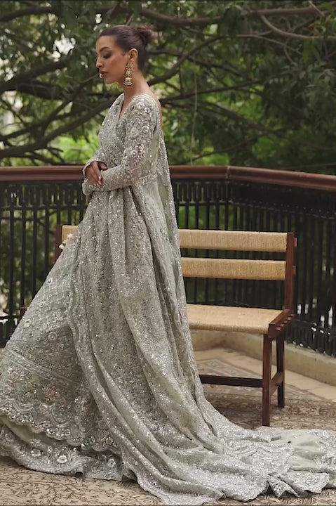Richly crafted in traditional techniques, this mint net peshwas is the embodiment of utmost charm. Detailed in zardoze accents in signature floral imagery, this ensemble comes with a brocade lehnga and a french net dupatta with worked scalloped edges.