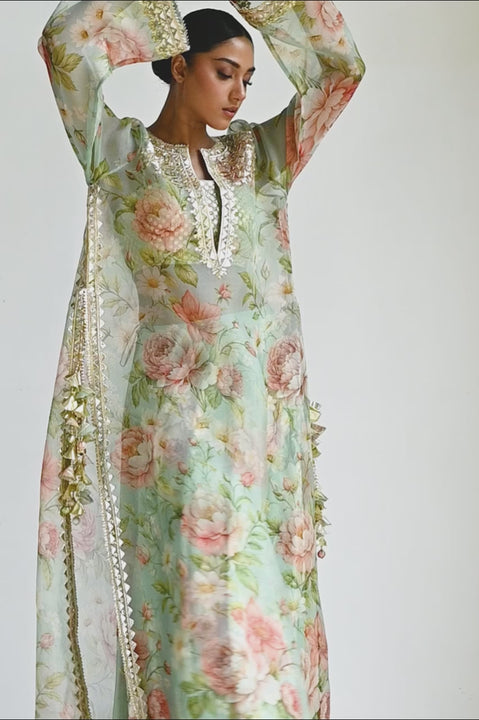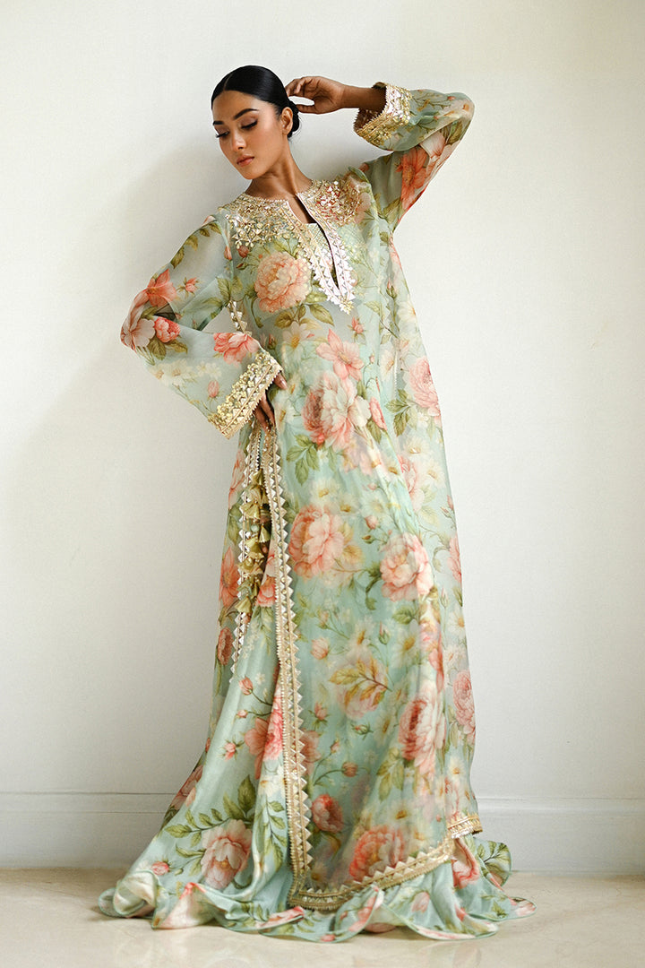 A misty tea green organza kaftan unfolds with painterly florals in soft blush and coral tones. The deep split neckline is framed with intricate hand embellishment in sequins, gota and thread accents that echo onto the khaddi silk tube top, catching the light with subtle brilliance. Full sleeves end in ornate gota borders, while tassel ties at the side slits add playful movement. The hemline, edged with shimmering gota, gives way to a matching printed khaddi silk lehenga that cascades into a pool of ruffles.