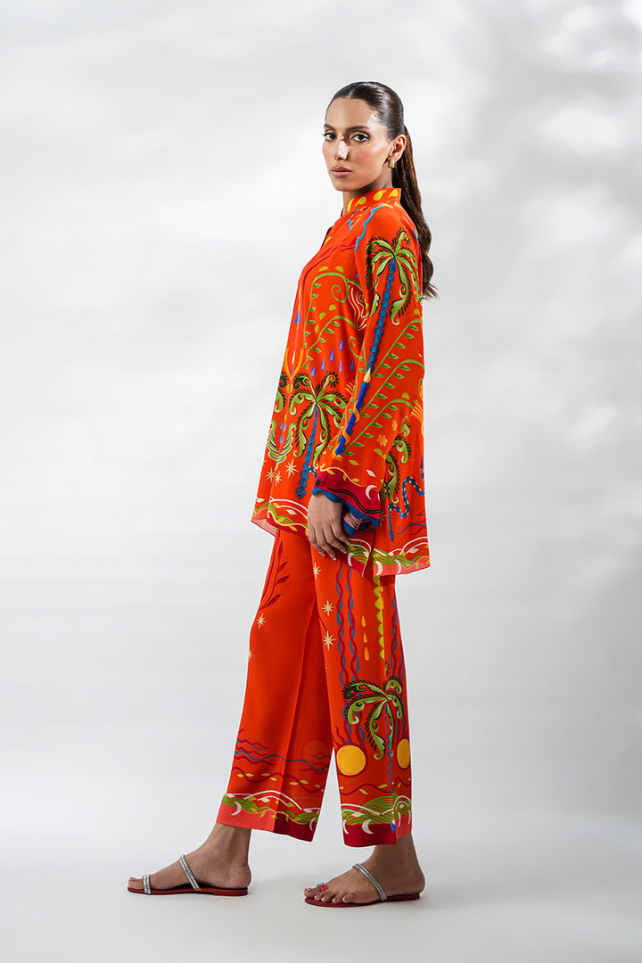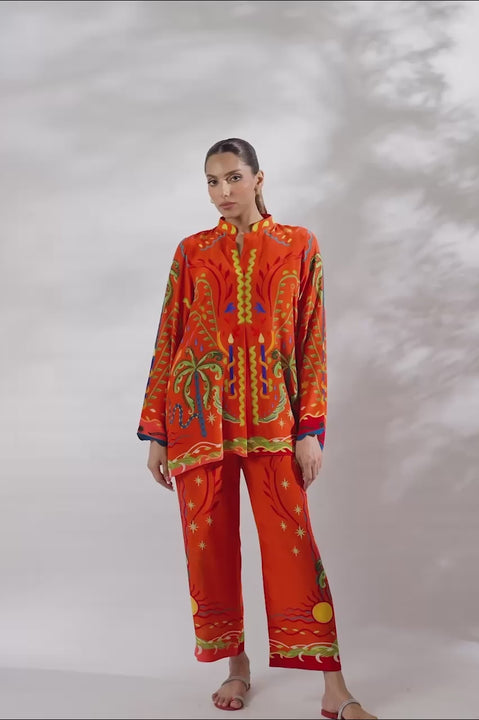 A striking crepe ensemble that radiates bold elegance. The relaxed top features a vivid print inspired by tropical and celestial motifs, brought to life in a vibrant palette of tangerine, cobalt, lime, and gold. The design continues seamlessly into coordinated culottes, where sun and palm motifs accent the hems. Finished with a sleek band collar and scalloped sleeves, the look embodies modern ease.