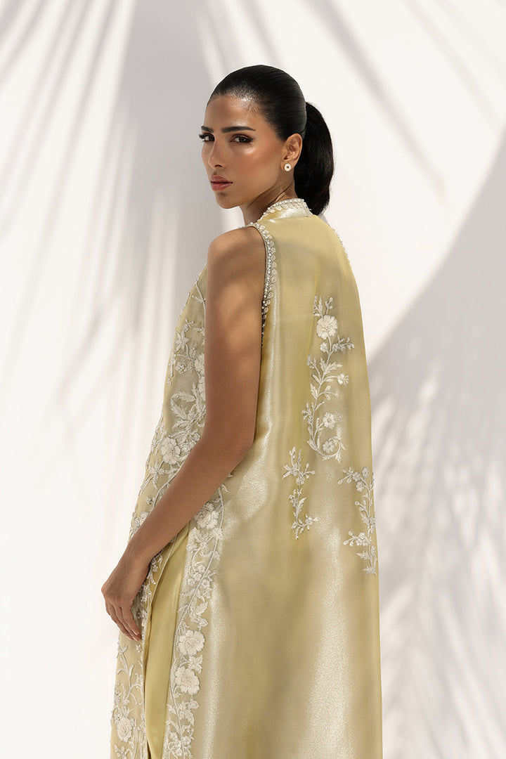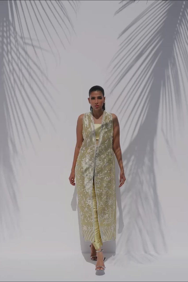 This radiant creation in soft butter yellow exudes timeless elegance, with intricate floral embroidery that dances across the fabric in delicate swirls of ivory and silver. The long, open-front silhouette is accentuated with exquisite detailing along the hem and front placket, striking a perfect balance between understated opulence and modern allure. A sleek charmeuse tube top and draped shalwar complete the look, complementing the jacket’s luminous texture with graceful ease.