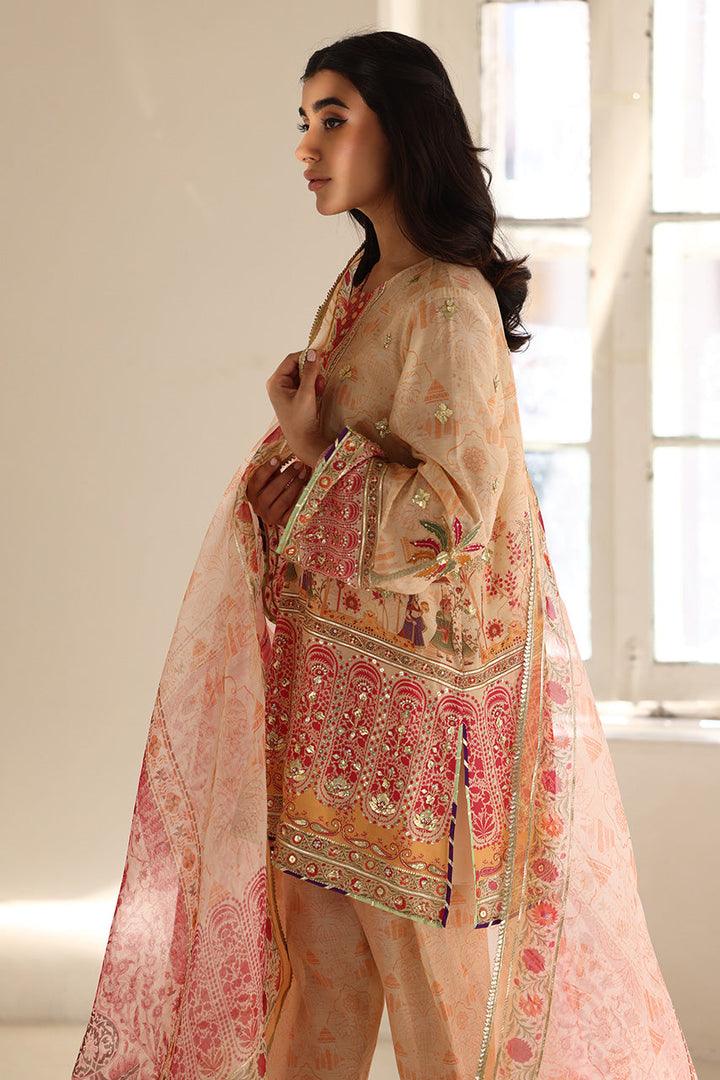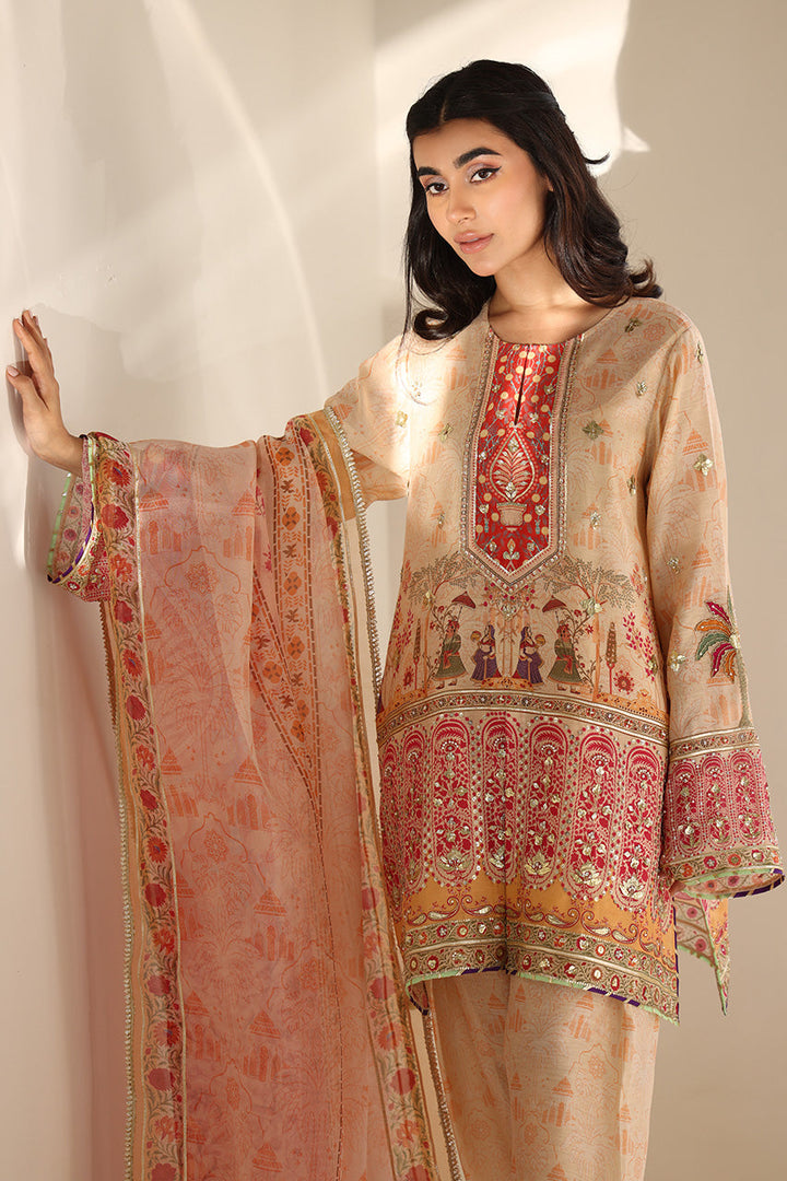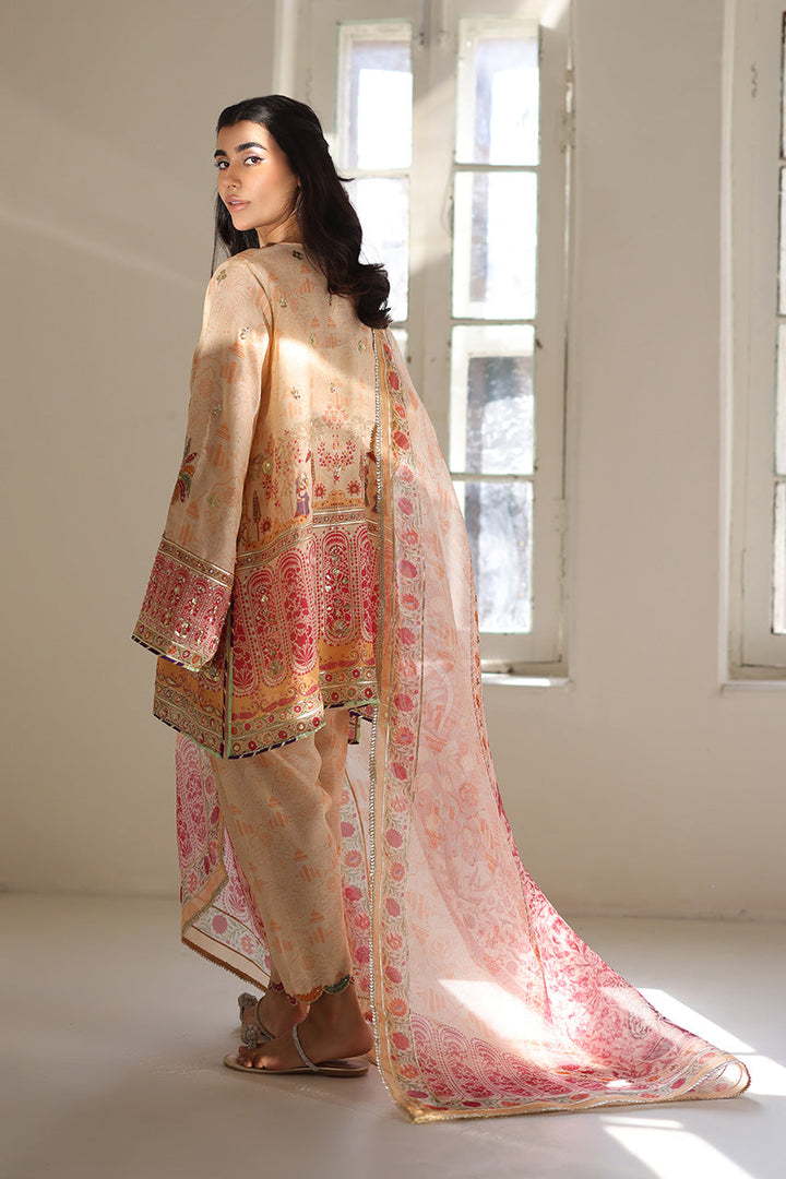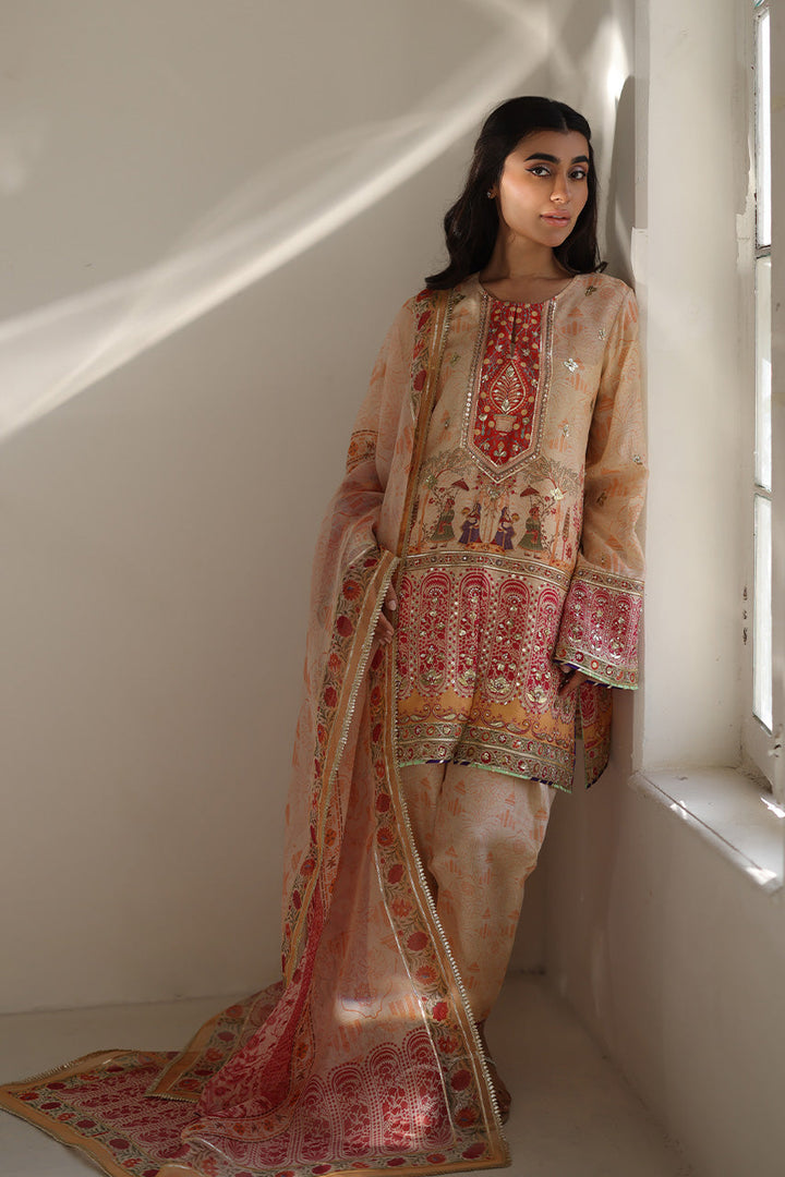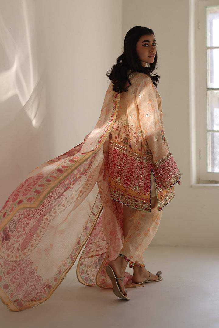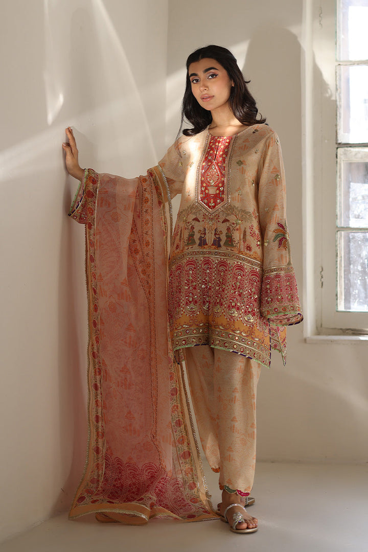 Exude timeless elegance with a richly detailed kurta adorned with heritage inspired embroidery and shimmering gota accents. Crafted from luxe khaddi silk, the shirt pairs effortlessly with an embroidered printed pure rawsilk shalwar. An intricately printed organza dupatta with gota details, completes the look.