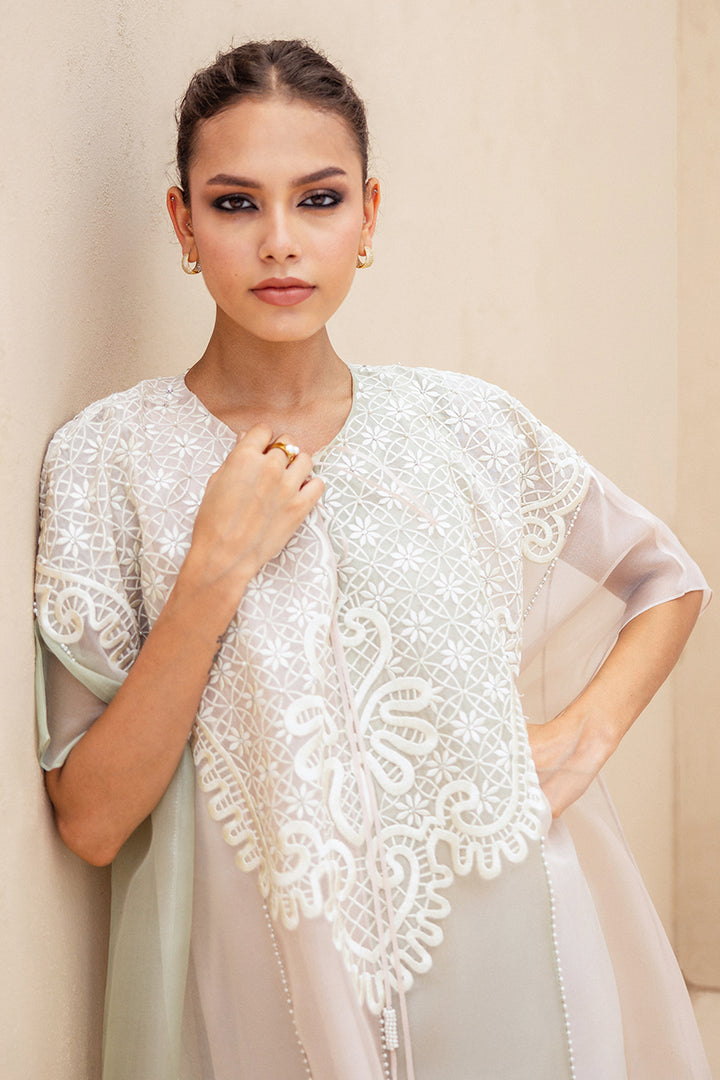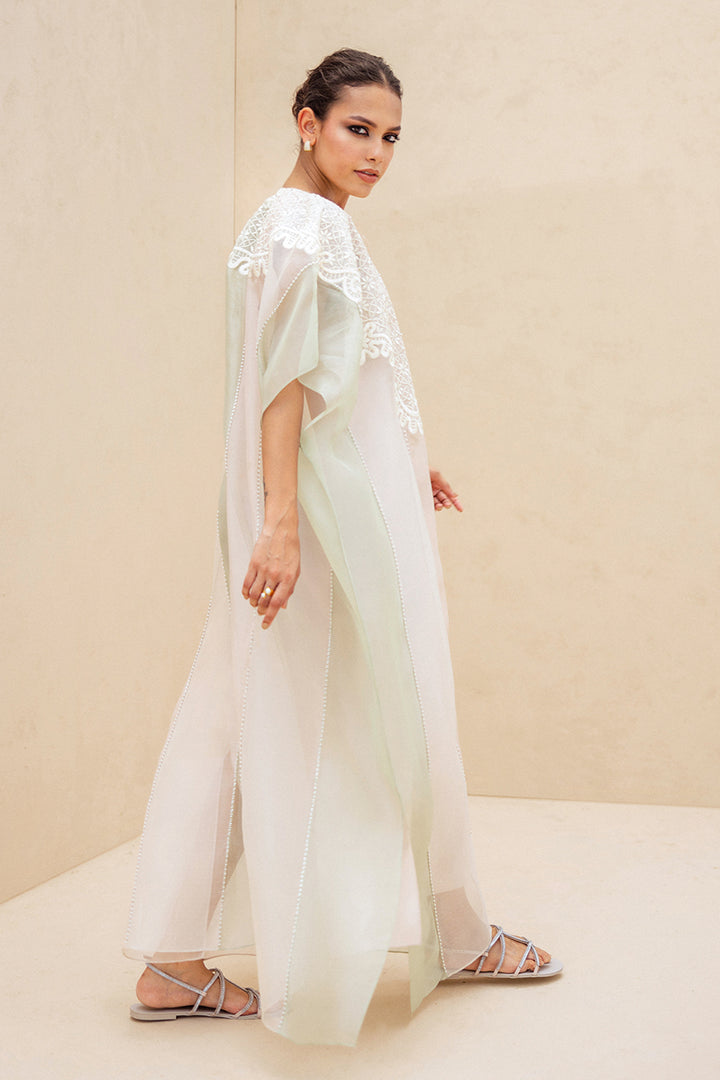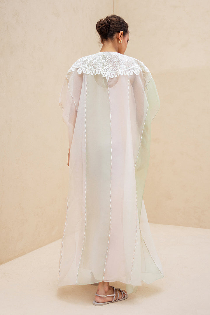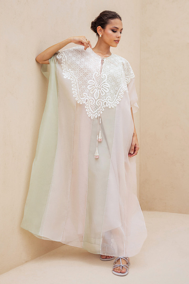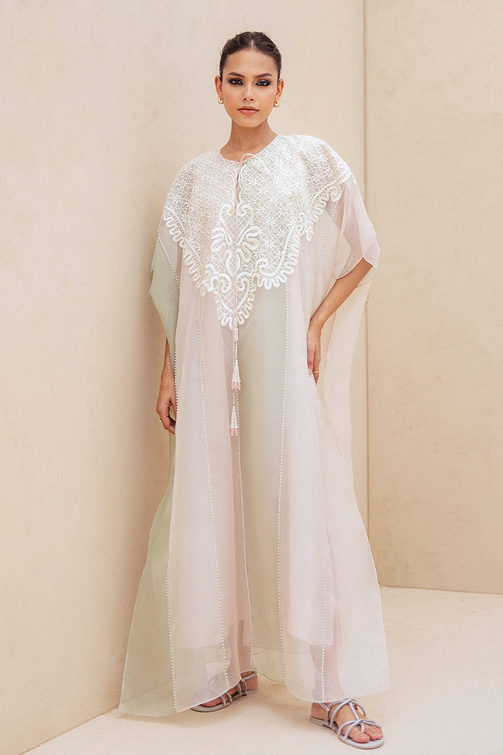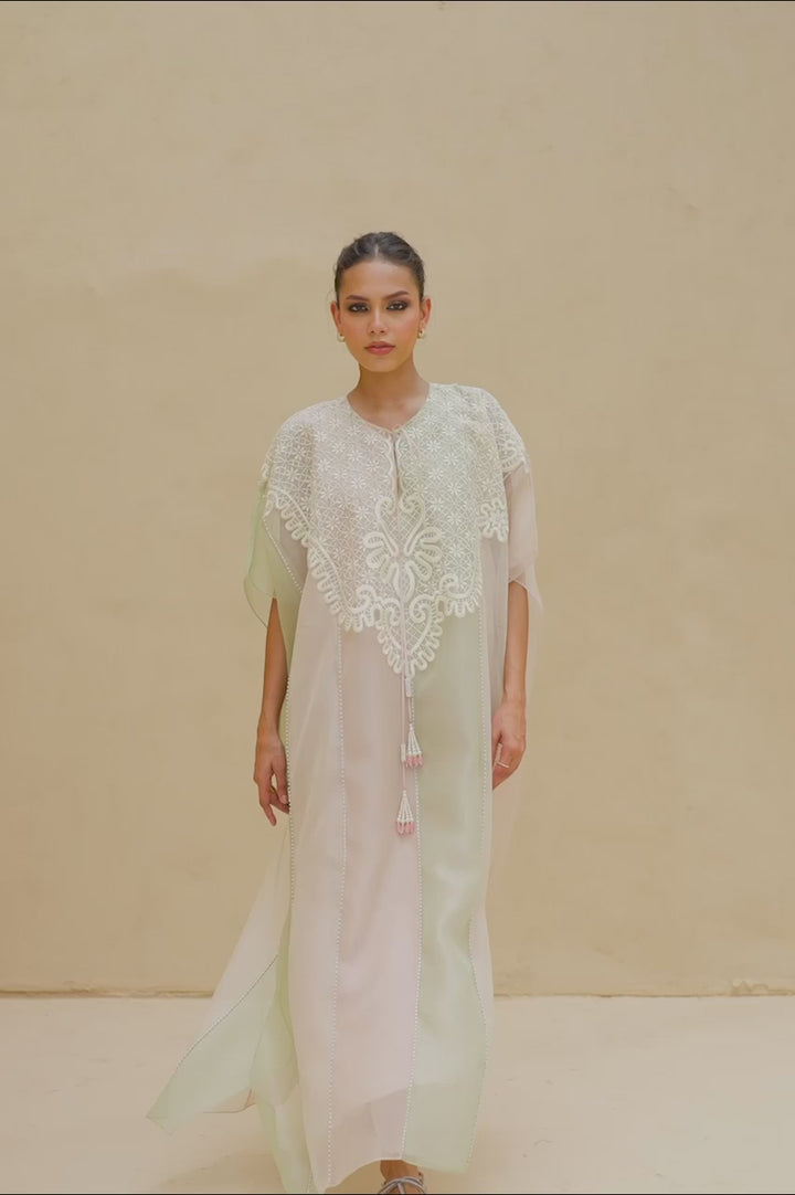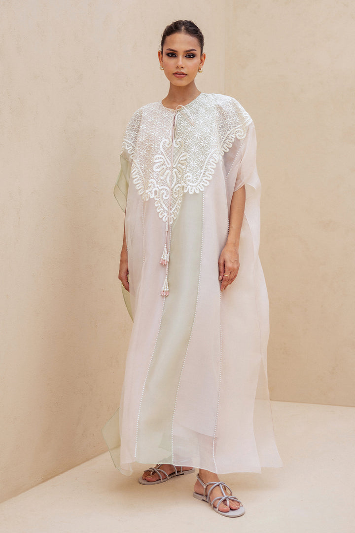 Whispers of ethereal lightness define this subtle colour blocked kaftan, imagined in sheer blush and tea green organza that drapes in soft fluid panels. The bodice and shoulders are adorned with intricate ivory embroidery, sequins and beadwork, framing the neckline with delicate refinement. A tasseled tie detail completes the yoke, while the silhouette flows in pale pastel hues that shift with quiet luminosity.