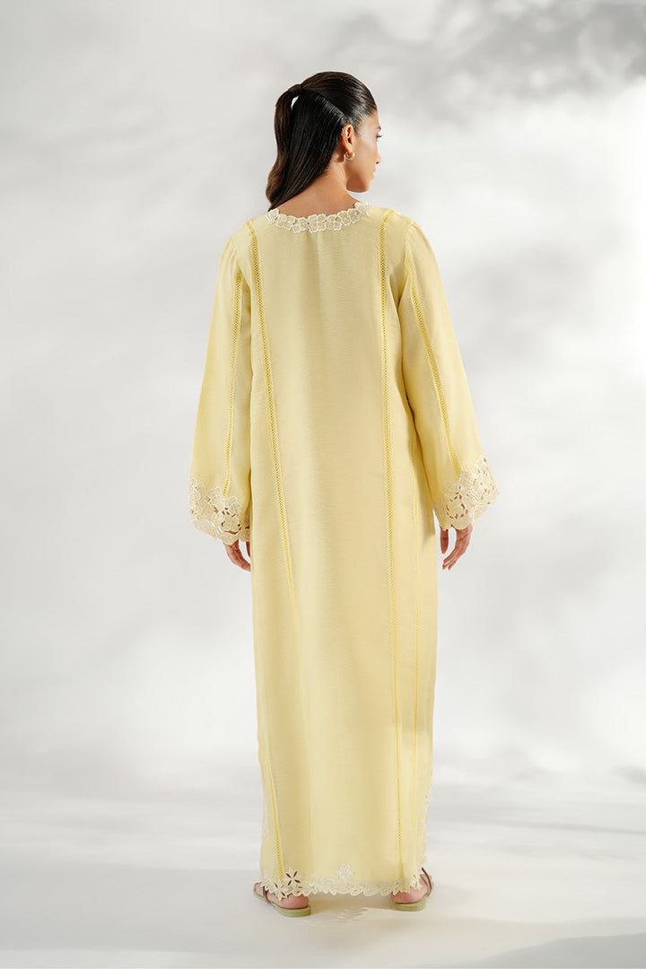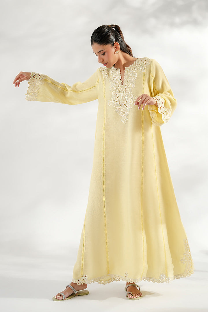 Rendered in a delicate whisper of butter yellow, this breezy khaddi corduroy kaftan is adorned with intricate ivory hued cutwork embroidery along the neckline, cuffs, and hem, exuding effortless sophistication. The split neckline redefines minimal elegance.