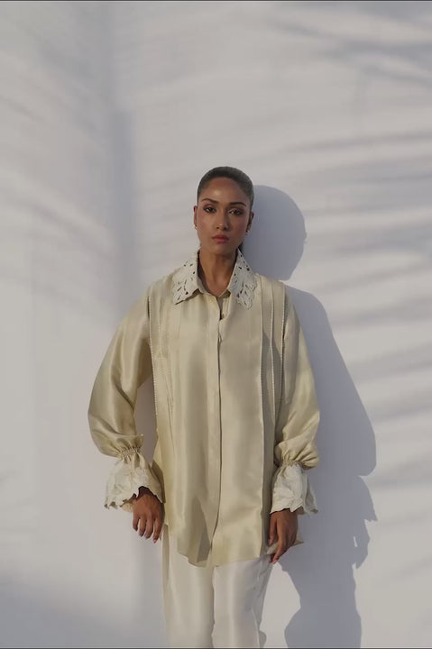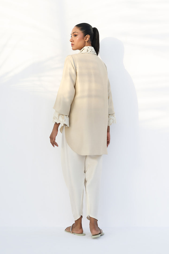 An effortlessly refined look in a serene ivory and champagne tone. The relaxed, button-down shirt in pure Raw Silk features an oversized silhouette with a scalloped cutwork collar and cuffs trimmed with applique and resham embellishment, lending a touch of soft romance. Paired with pure Raw Silk tapered shalwar detailed with sand-hued applique embroidery along the hem, the ensemble strikes the perfect balance between contemporary ease and quiet sophistication.