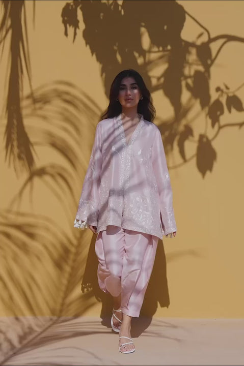 Embodying a soft, poetic charm, this blush pure rawsilk ensemble is defined by a breezy front open jacket, delicately embroidered in ivory with subtle hints of gold. Playful silk tassels fringe the wide flared cuffs, adding movement and character. Finished with a refined V neckline and paired with a voluminous pleated shalwar that tapers at the ankle, the monochromatic look feels whimsical yet expertly tailored.