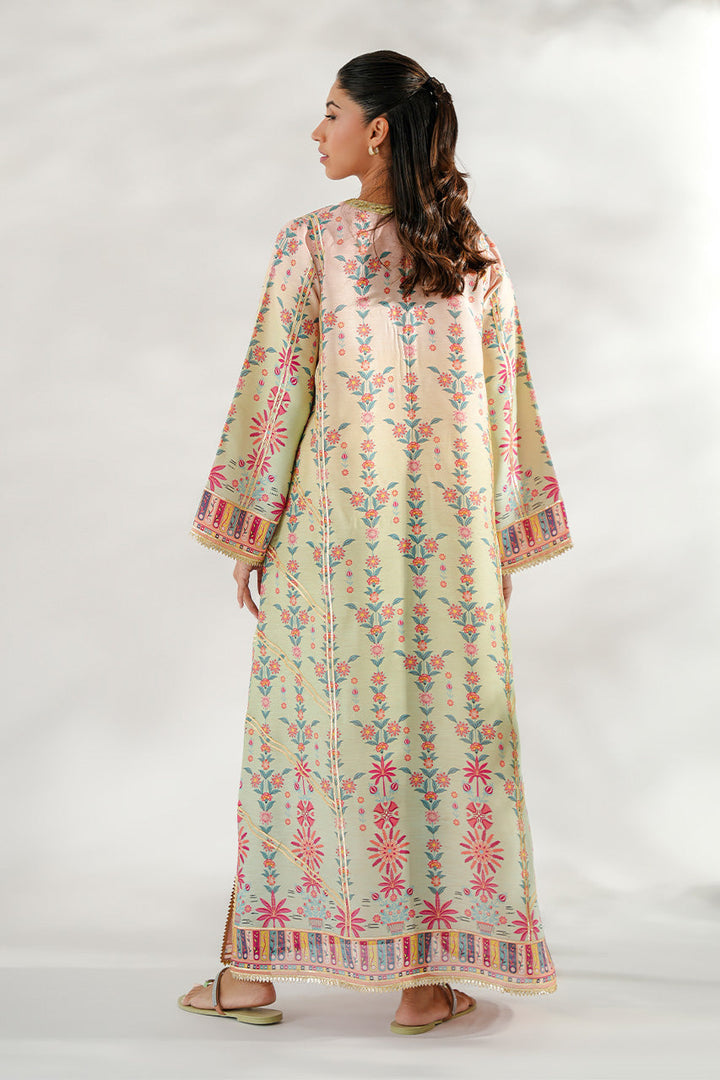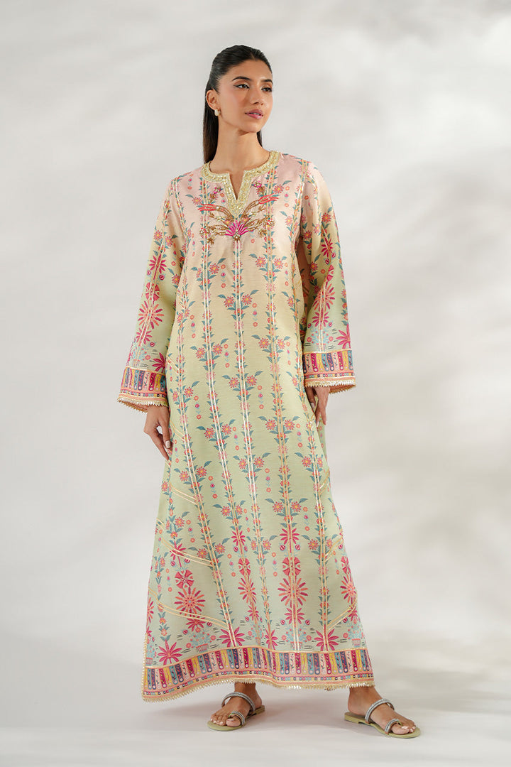 Delicate zardozi embroidery and intricate gota accents elevate this painterly pastel ombré kaftan, cut from lightweight khaddi silk. Washed in a blush base that melts into florals of pink and coral, the silhouette drifts in a soft gradient of color. The neckline, sleeves, and hemline shimmer with refined gota work, while a statement geometric border with subtle accents grounds the look in layered pastel elegance.