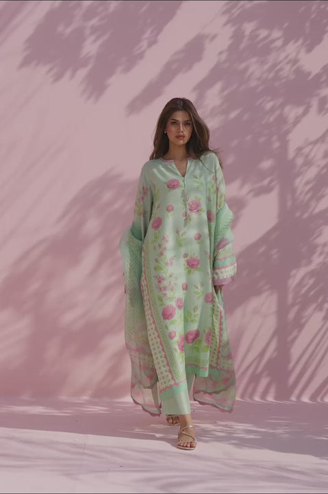 A serene mint green ensemble defined by soft florals and gentle movement. The long shirt features a delicate rose print in blush and sage, finished with subtle borders along the neckline, cuffs, and hem. Paired with matching pure rawsilk trousers for a clean finish, the look is completed with a sheer organza dupatta in a coordinated floral print, draping effortlessly for understated elegance.