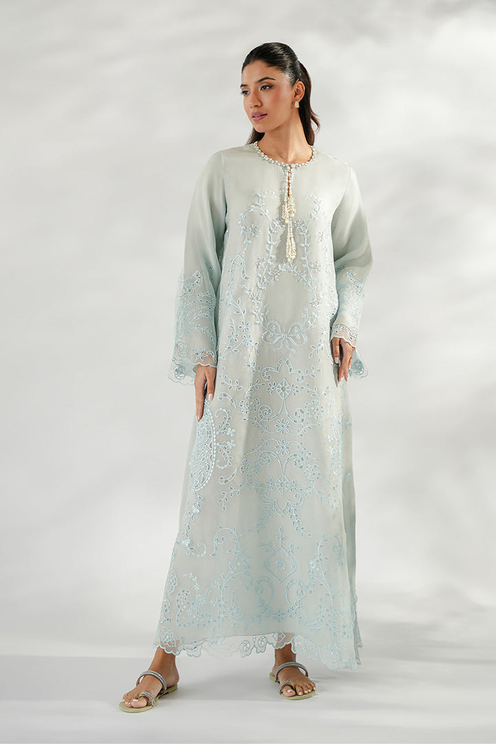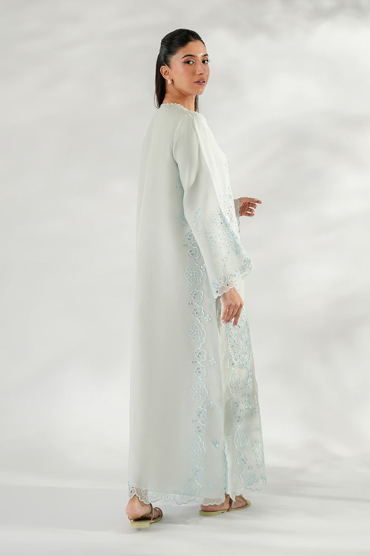A statuesque silhouette in sheer organza layered over tonal silk, cut with serene simplicity. The round neckline is finished with delicate beaded tassels, a subtle nod to couture embellishment. Tonal embroidery in frost blue traces arabesque florals and latticework across the canvas, while wide sleeves and a scalloped hem mirror the intricate needlework. The result is modern refinement wrapped in timeless grace.