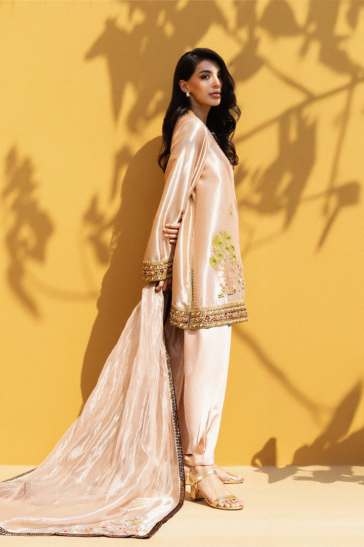 This look brings a soft, luminous take to festive elegance in a rose quartz hue. Intricate zardoze embroidery, inspired by Mughal warriors, tells a story along the front of the tissue shirt, while contrasting embellished velvet borders highlight the neckline, sleeves, and hemline, adding richness to the piece. The soft charmeuse shalwar reflects the same gentle tone, keeping the silhouette refined and cohesive. A fluid, diaphanous tissue dupatta drapes dramatically, finished with zardoze embroidery on velvet edging for a quietly luxurious touch.