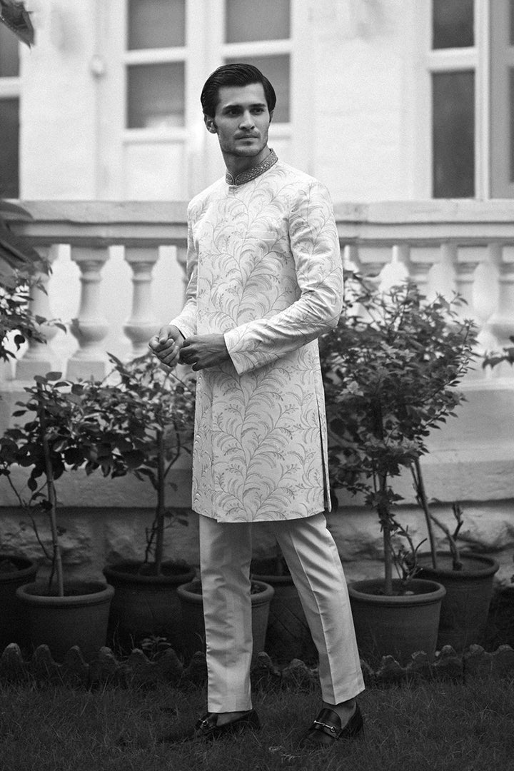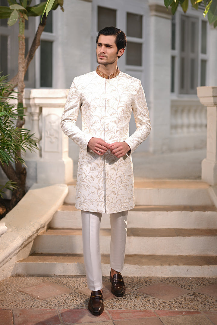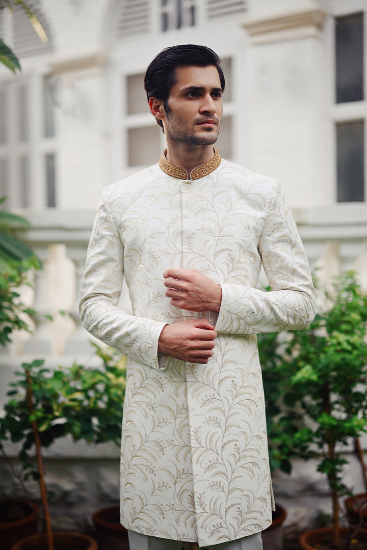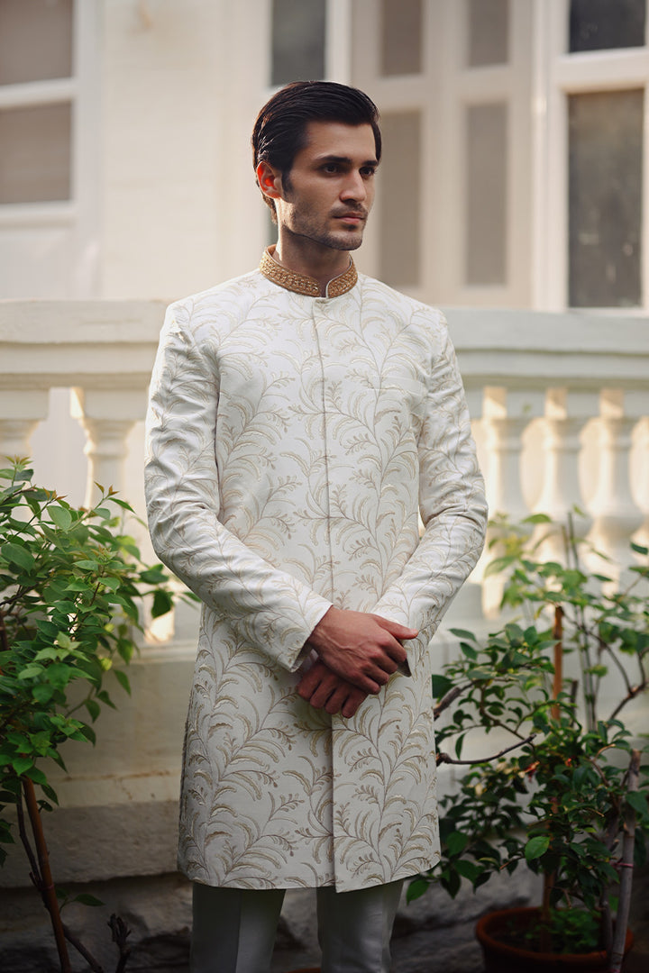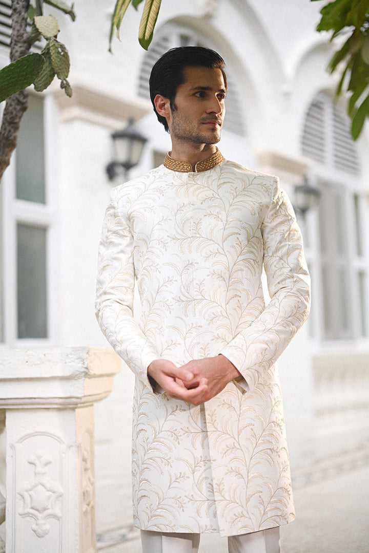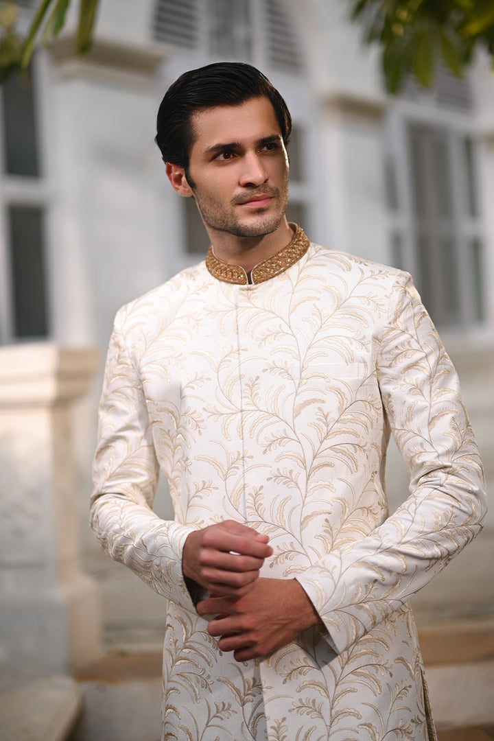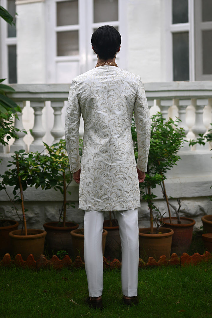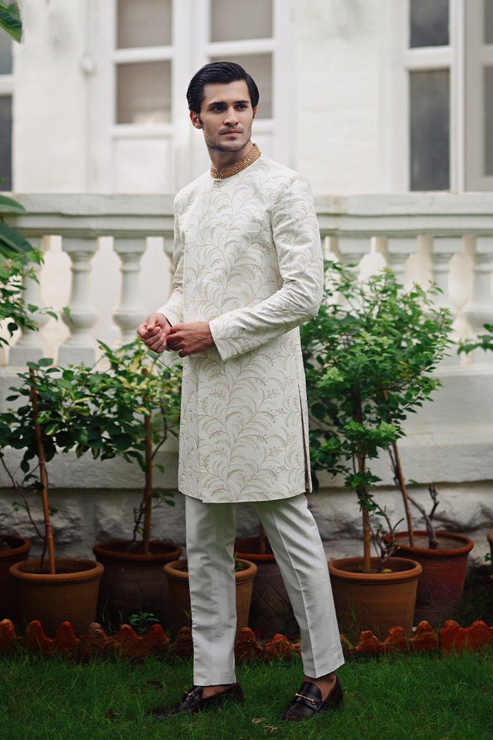 A tailored sherwani in ethereal pearl-hued pure raw silk, illuminated with lustrous gold threadwork in fine botanical motifs that unfurl like climbing vines. The antique gold embroidered collar lends a regal accent, while slim raw silk pants in pristine pearl complete the ensemble with timeless elegance.