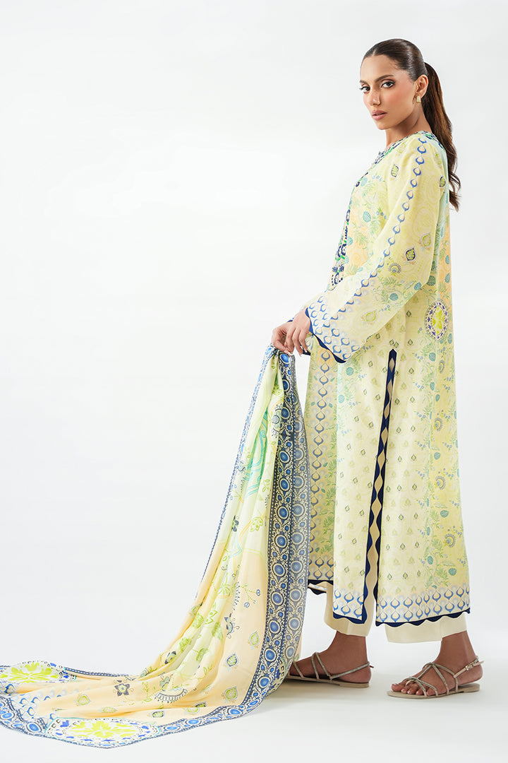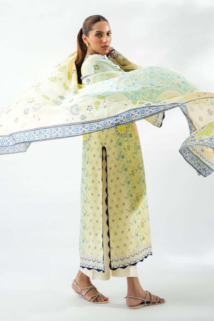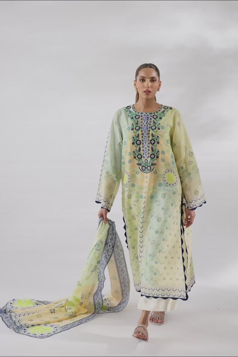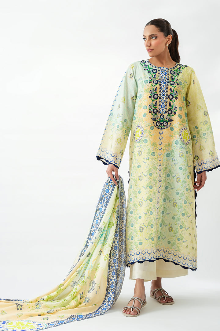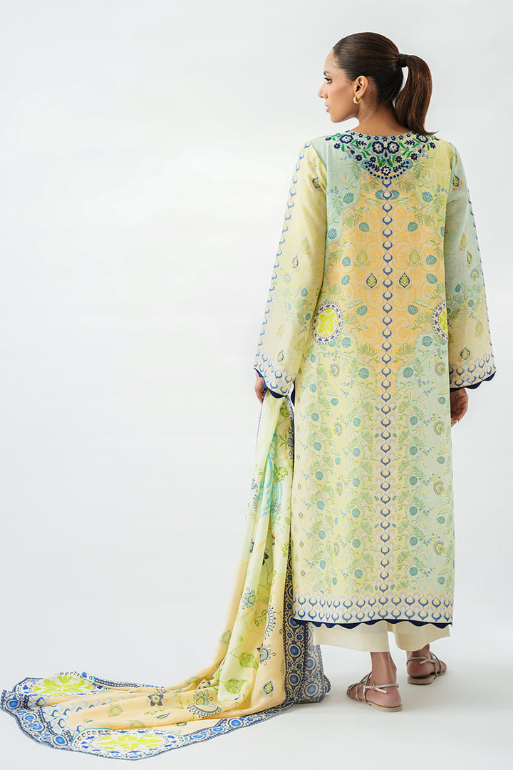 Bathed in soft lemon and tea green ombre tones, this three piece set carries a quiet luminosity. The khaddi silk kurta falls in a straight silhouette, its surface adorned with intricate embroidery in indigo and forest green, forming a tapestry of ornamental motifs along the neckline. Indigo toned scalloped borders finish the sleeves and hem, adding refined detail. Paired with pure rawsilk culottes in eggshell, the look is completed with a gossamer medium silk dupatta, scattered with delicate botanical prints and framed with a vivid indigo border, echoing modern ease.