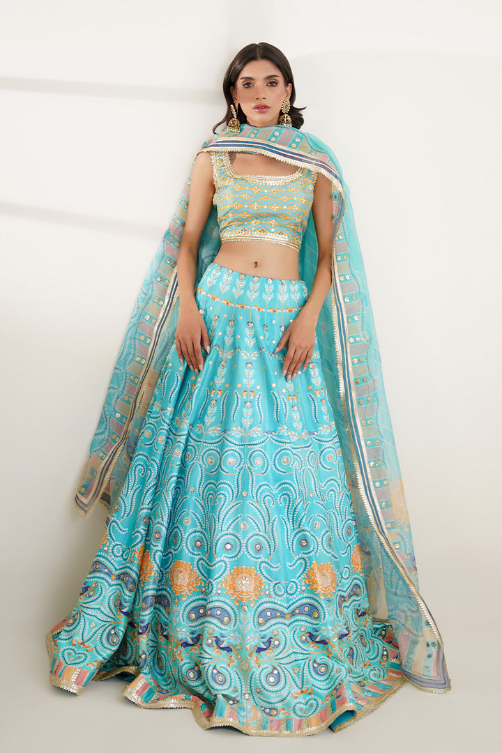 Revitalise your festivities with a striking aqua hued khaddi silk lehenga and pure rawsilk choli. Printed floral sprigs make way for a vintage chunri inspired print on the voluminous hem of the lehnga; perfectly complemented by a matching choli with pale yellow and pink tessellations, lined with dense gota borders. The gota details elevate the subtlly elegant print which continues on the matching organza dupatta.