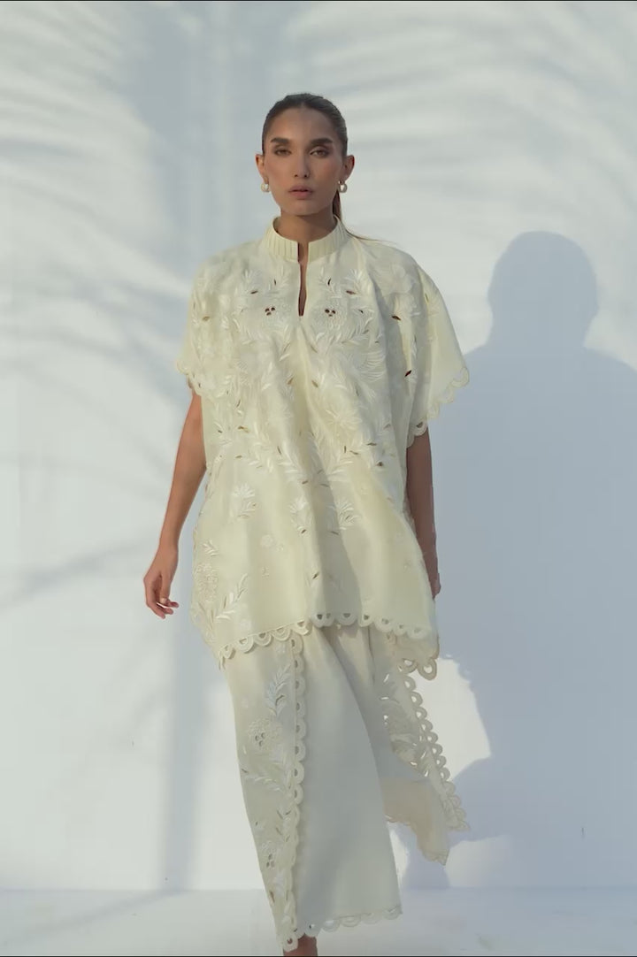 This ivory-hued pure Raw Silk outfit makes a statement with a textural, cutwork design. A box cut shirt with a mandarin collar, adorned with intricate, oversized floral cutwork embroidery and a scalloped hem. The top is paired with flared overlap pants that continue the same detailed floral cutwork, featuring a scalloped border. The look is entirely defined by the striking three-dimensional texture created through resham and appliqué craftsmanship.
