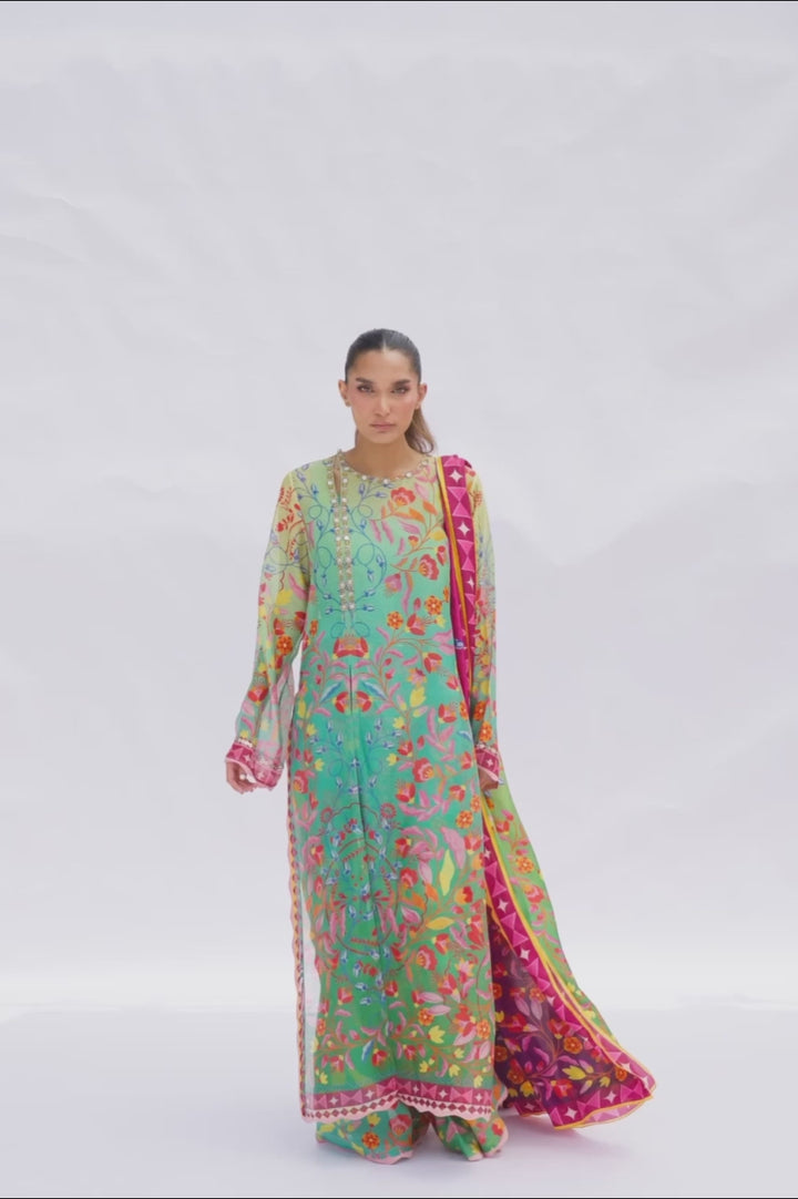 A three piece set unfolds on a seafoam canvas, alive with vivid florals reminiscent of a painted garden at dusk. An A line cotton net kurta flows with blush scalloped accents, a dramatic side slit and an embroidered neckline, while scalloped cuffs frame its sleeves. Wide palazzos in matching cotton net echo the motif in quiet harmony. A fluid medium silk dupatta, edged with magenta borders and shaded in seafoam ombre, is scattered with jewel toned vines and blossoms, completing the look in a symphony of colour and craft.