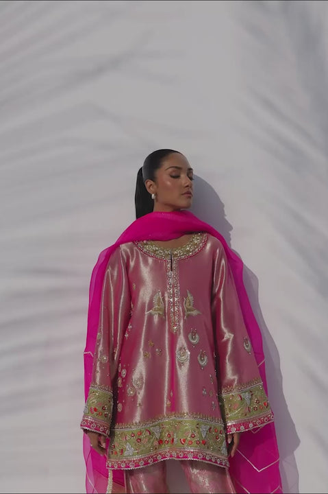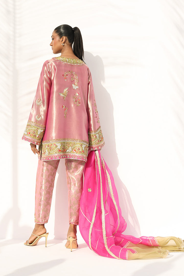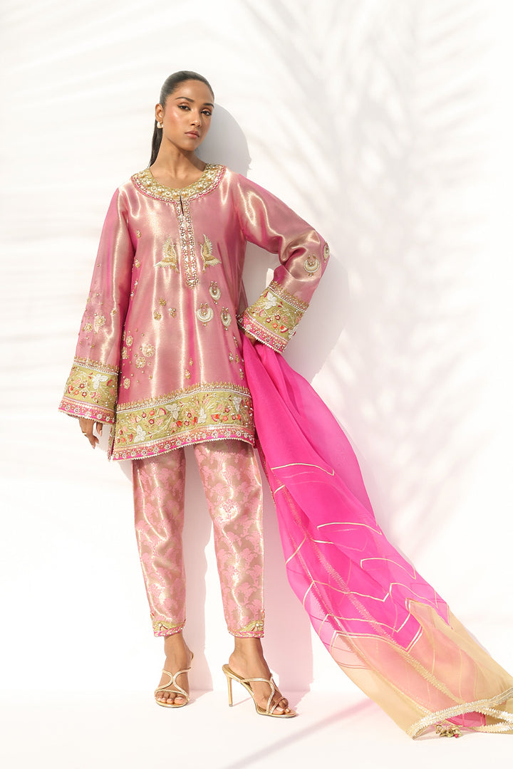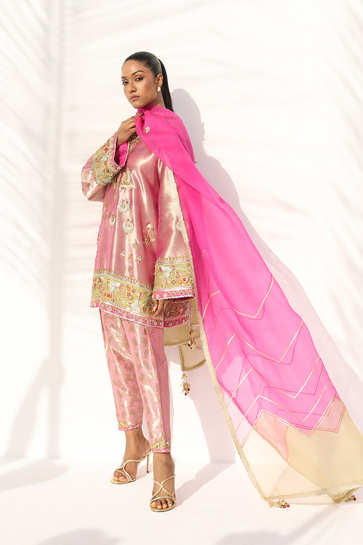 Rendered in a lustrous rose quartz hue, this ensemble exudes refined sophistication. The tissue kurta is adorned with intricate zardoze, gota, and pearl embroidery, while lime hued embellished appliqué frames the neckline, cuffs, and hem with graceful precision. It is paired with a structured brocade shalwar featuring delicately embroidered borders in lime and fuchsia. A gossamer ombré organza dupatta in fuchsia and champagne, detailed with gota accents, completes the look with an air of effortless elegance.