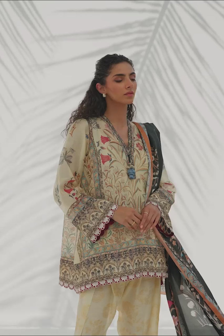 In a rich medley of earthy and ebony tones, the relaxed cotton net top is adorned with a dense, scenic botanical print reminiscent of ancient tapestries, rendered in muted shades of terracotta, green, and deep charcoal. It is paired with a pure Raw Silk draped shalwar in a softly patterned buttermilk hue, adding balance and fluidity. A contrasting medium silk dupatta in deep ebony, featuring bold florals framed by vibrant graphic borders, completes the look with a striking interplay of color and craft.