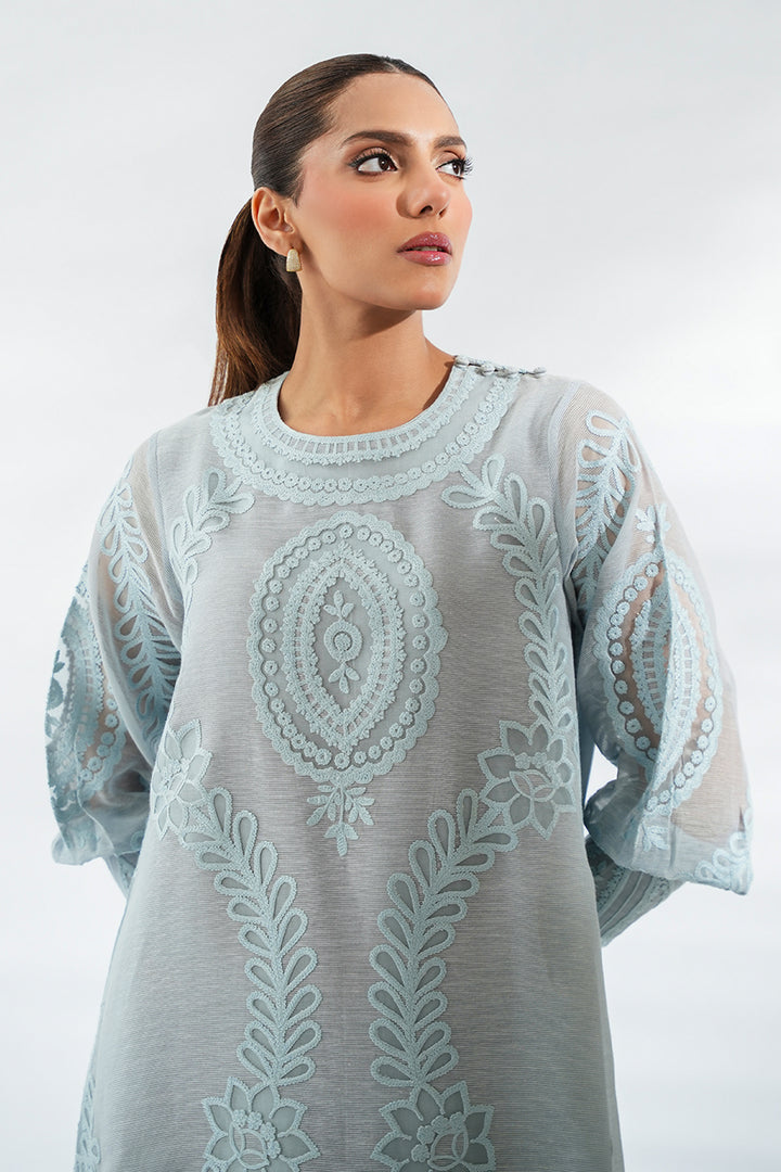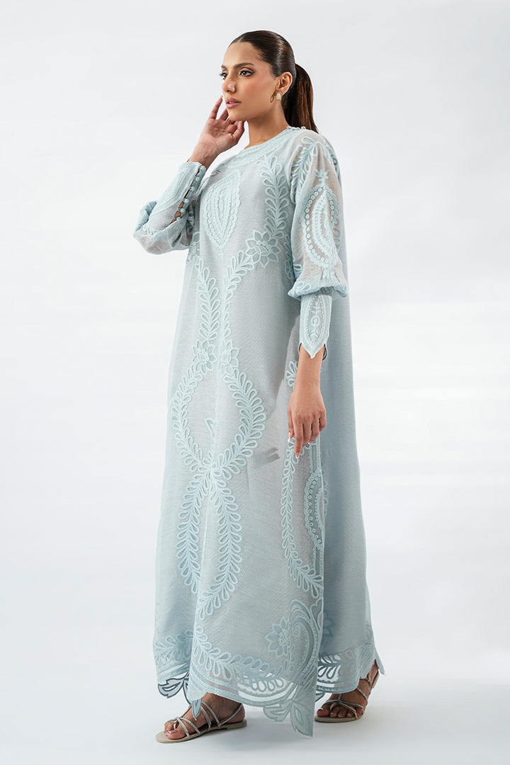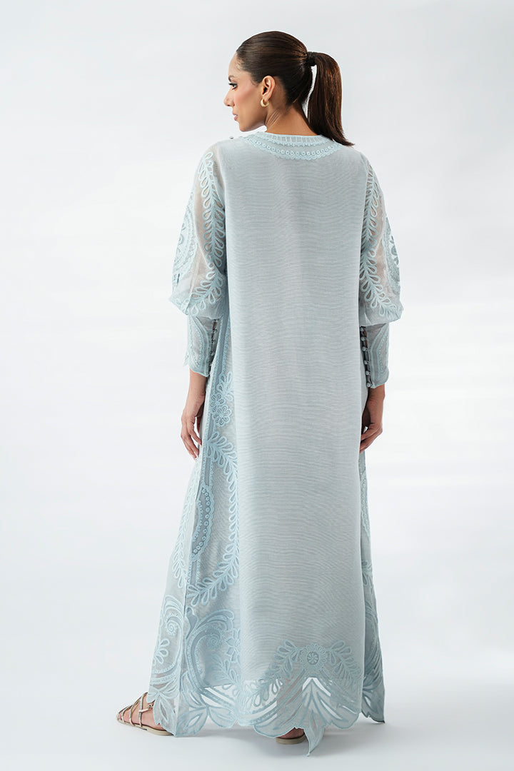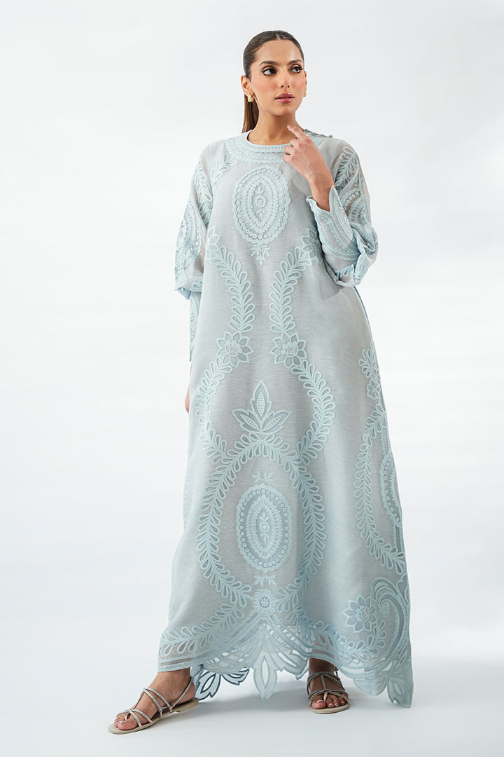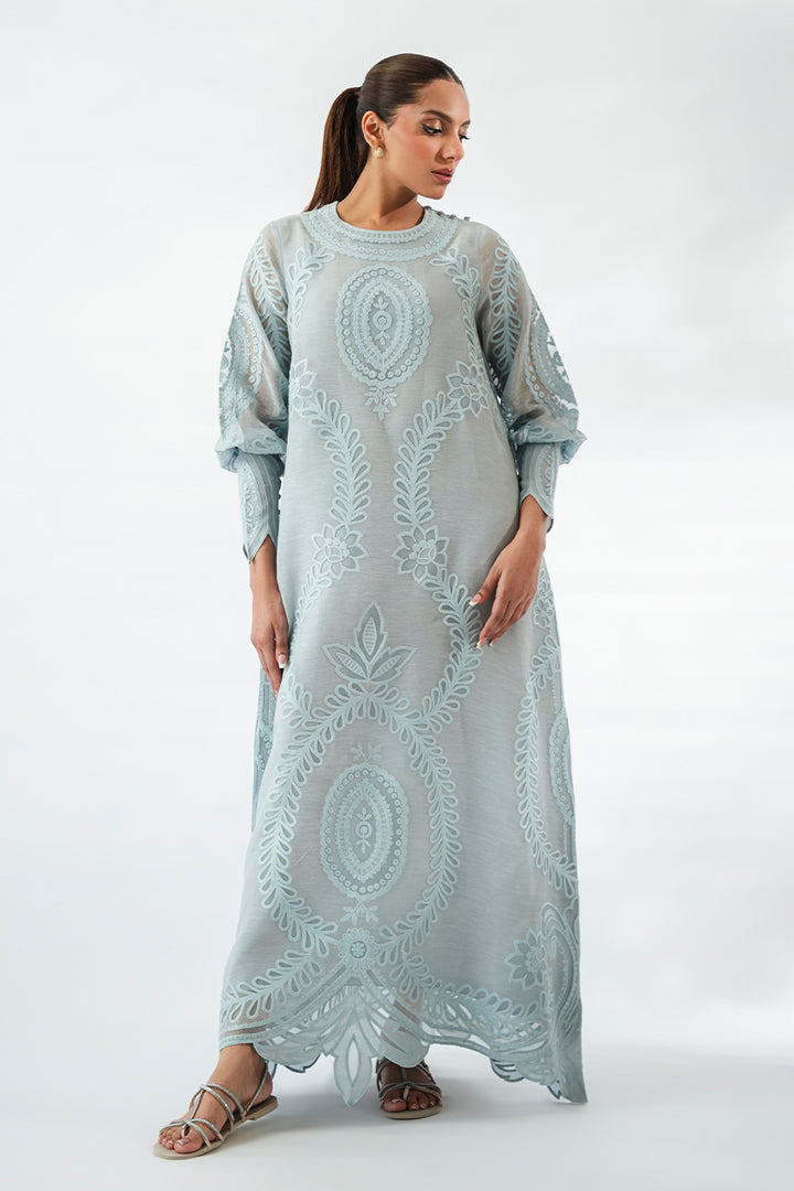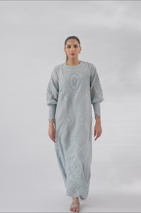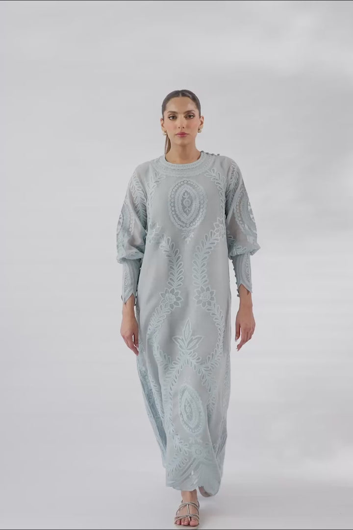 A sublime creation in soft misty blue, this khaddi corduroy kaftan is adorned with ornate aari embroidery. It is finished with dramatic scalloped cuffs and a scalloped hemline detailed with organza eyelet inserts.