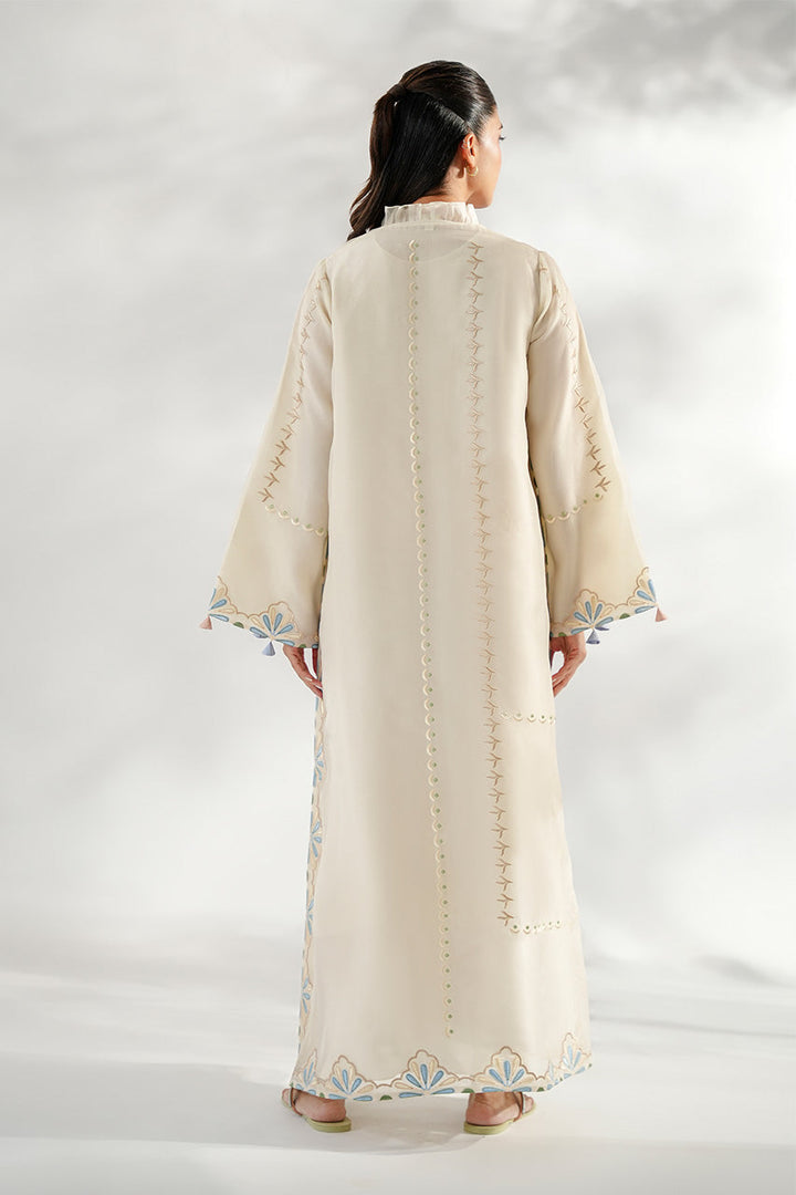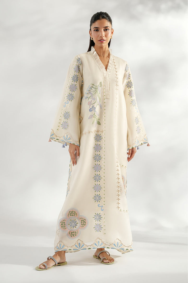 A sculptural kaftan in soft ivory organza with a gentle sheen, cut to a clean V neckline framed by delicate stitch detailing. Wide sleeves extend with quiet volume, while embroidery blooms in pastel lilac, celadon, and powder blue. Starburst florals and arabesque motifs unfold through intricate appliqué, creating a piece that bridges artisanal tradition with modern restraint.