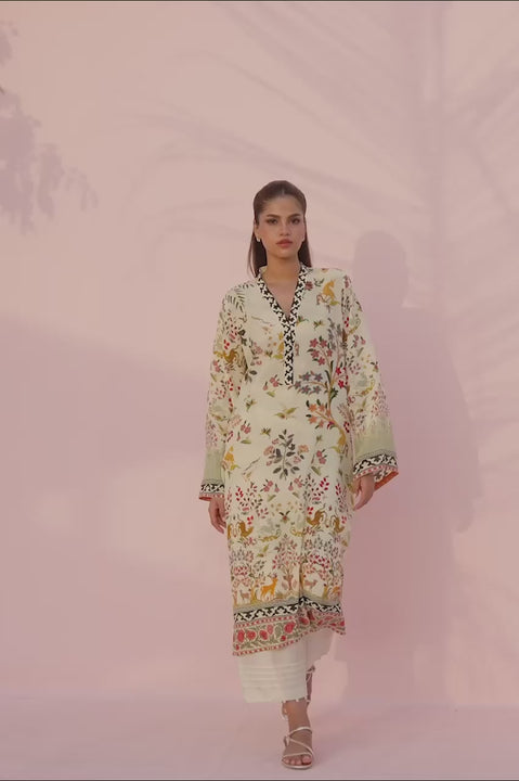 A fluid ensemble crafted in lightweight printed crepe, set on a warm cream base and brought to life with an intricate tapestry of botanical, floral, and fauna inspired motifs. Delicate birds and foliage unfold across the surface, anchored by richly patterned borders framing the neckline, flared sleeves, and hem for a crisp, defined finish. Paired with cream pure rawsilk culottes, the look feels fresh, polished, and effortlessly elegant.