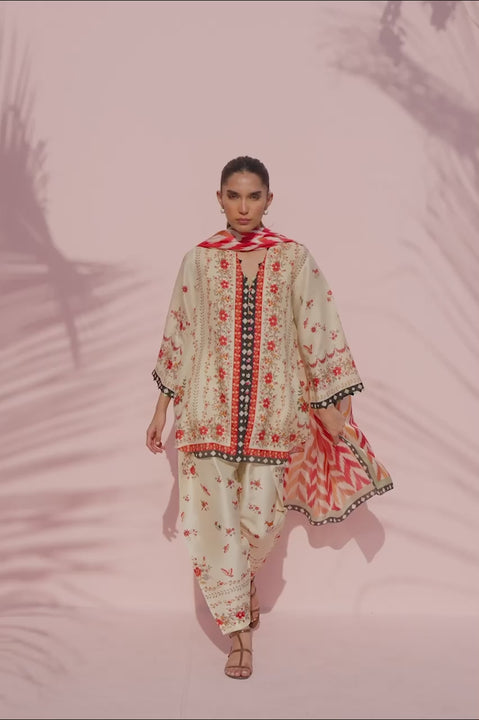 A relaxed co ord set in a warm cream hue is brought to life with scenic and floral motifs in tones of coral, rust, and soft peach. The shirt features a boxy silhouette with wide sleeves, framed by geometric borders in black and crimson that define the neckline, placket, and cuffs, and is paired with a tapered shalwar detailed with coordinated borders and scattered whimsical motifs. A medium silk dupatta in a bold ikat inspired print, blending burnt tangerine, mustard, and cream, is finished with a contrasting border, adding movement while maintaining an effortless feel.