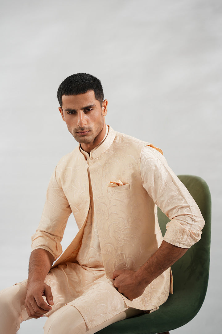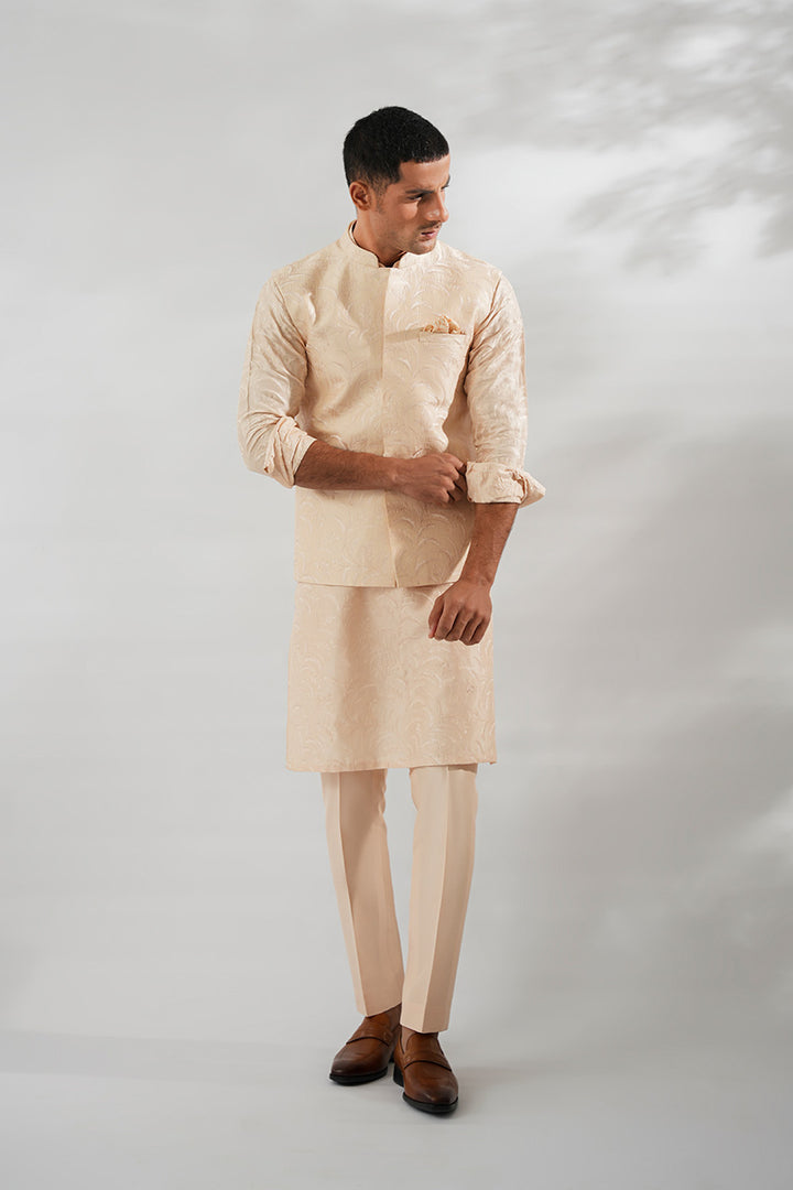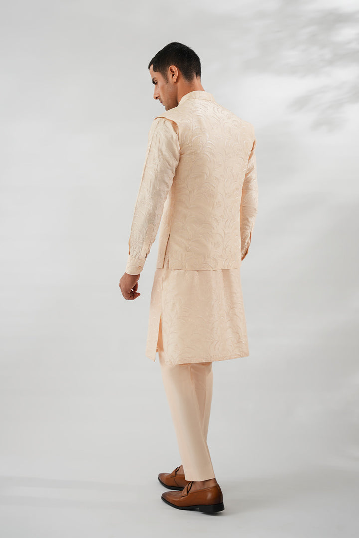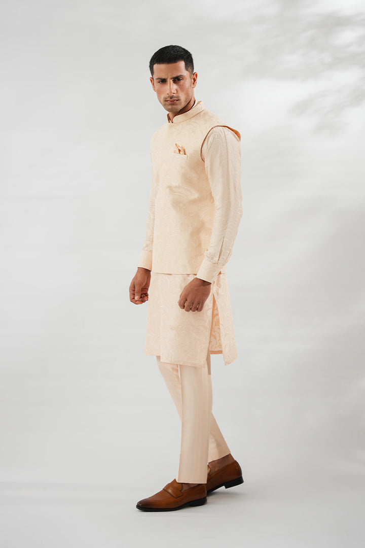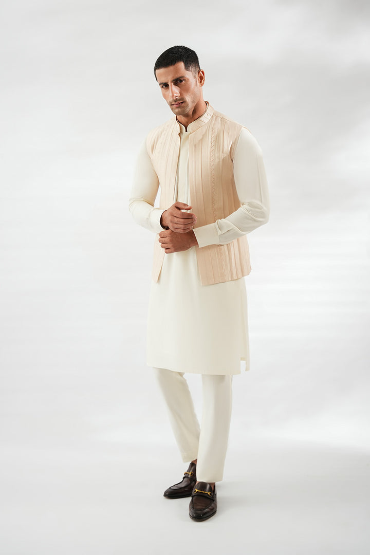 An ivory kurta set is paired with a front-open waistcoat in a soft blush tone, elevated with refined pintuck detailing. The structured tailoring of the pure raw silk ensemble and mandarin collar lends a modern edge to tradition, creating a look that balances understated charm with festive refinement.
