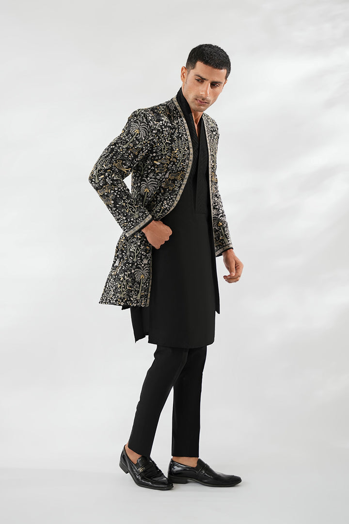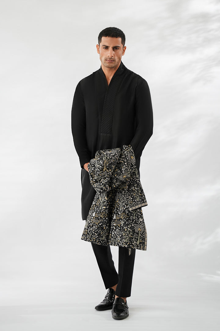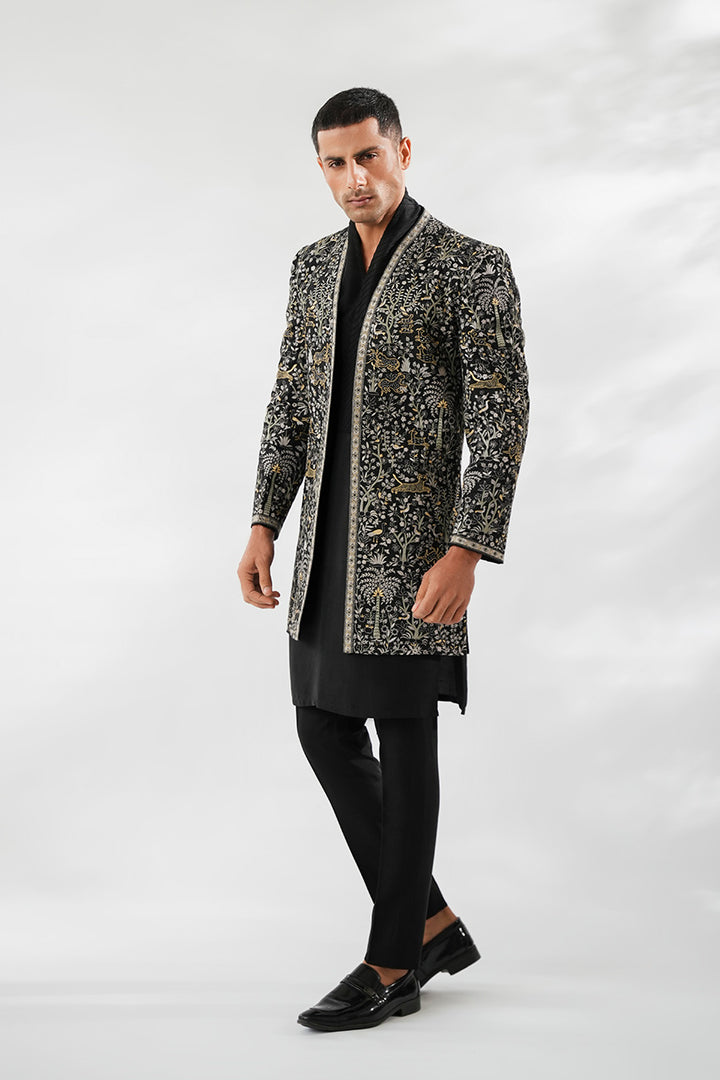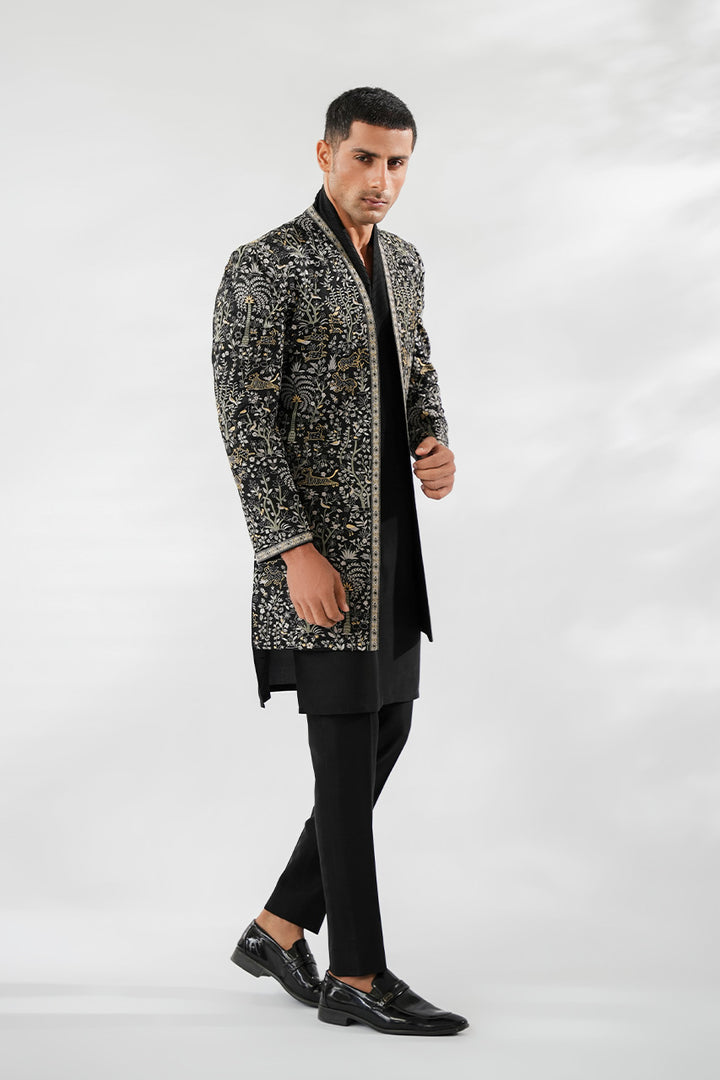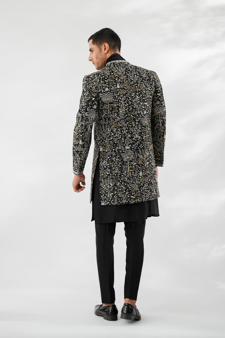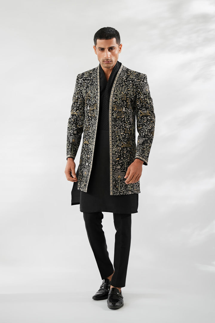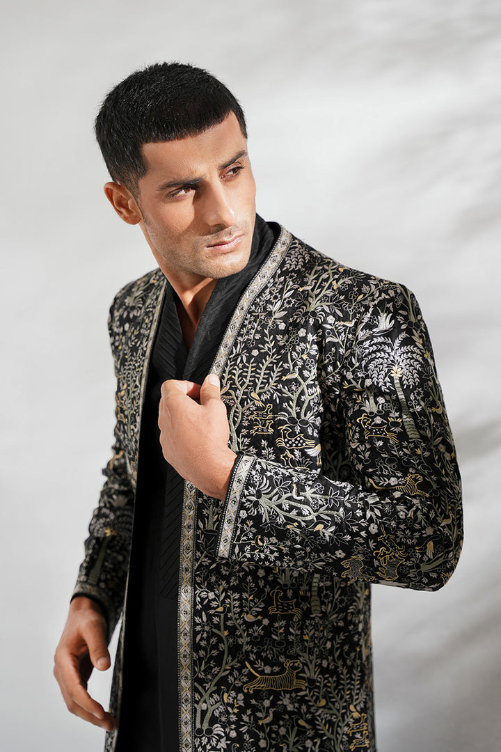 An elevated take on the classic, this ebony front open sherwani in self jamawar is adorned with intricate aari embroidery depicting wildlife motifs across the front. Layered over a coordinating raw silk shirt with a statement pleated neckline, the ensemble is grounded with tapered raw silk pants for sharp sophistication.